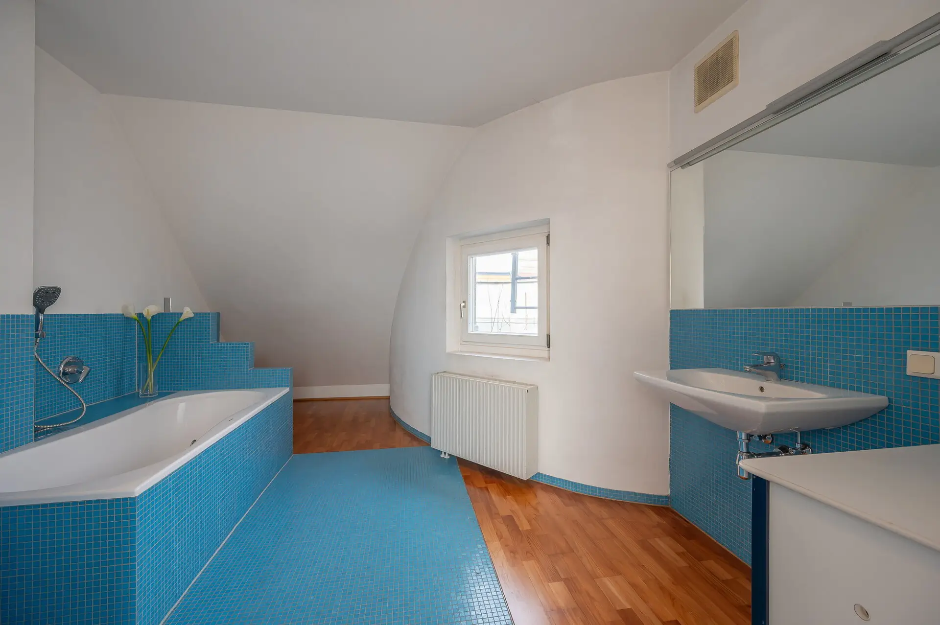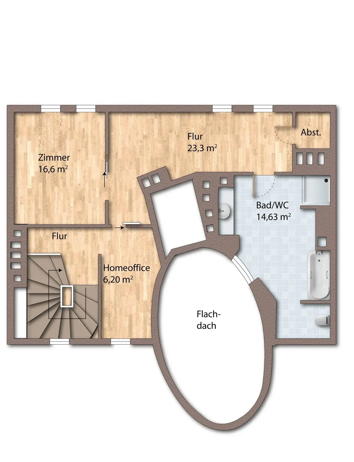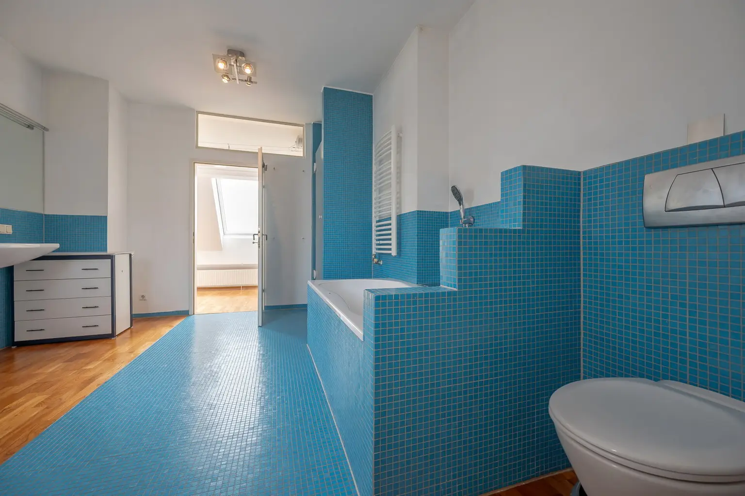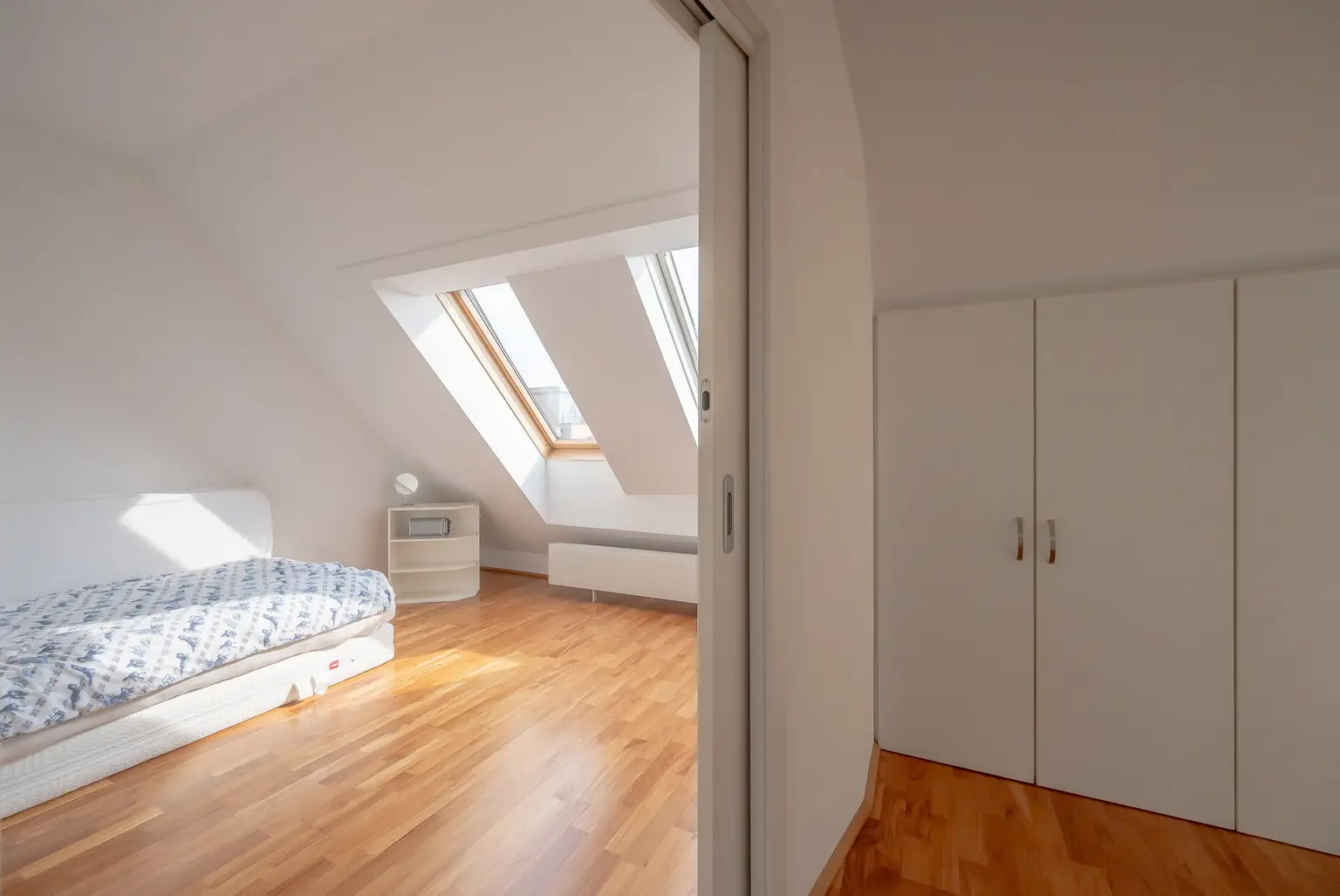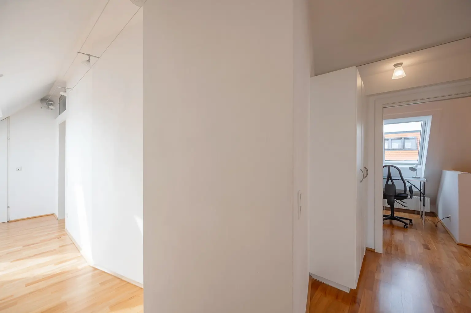 Im Obergeschoss befinden sich ein weiteres Schlafzimmer, ebenfalls mit einer Größe von ca. 16m². Neben dem Treppenaufgang ist ein Bereich, der sich wunderbar als Home-Office eignet. Durch den hellen Flurbereich mit seinen vom Tischler angefertigten Einbauschränken wird es Ihnen in dieser Wohnung nicht an Stauraum mangeln. Das großzügige Badezimmer verfügt über Badewanne, eine extra Dusche und eine weitere Toilette.