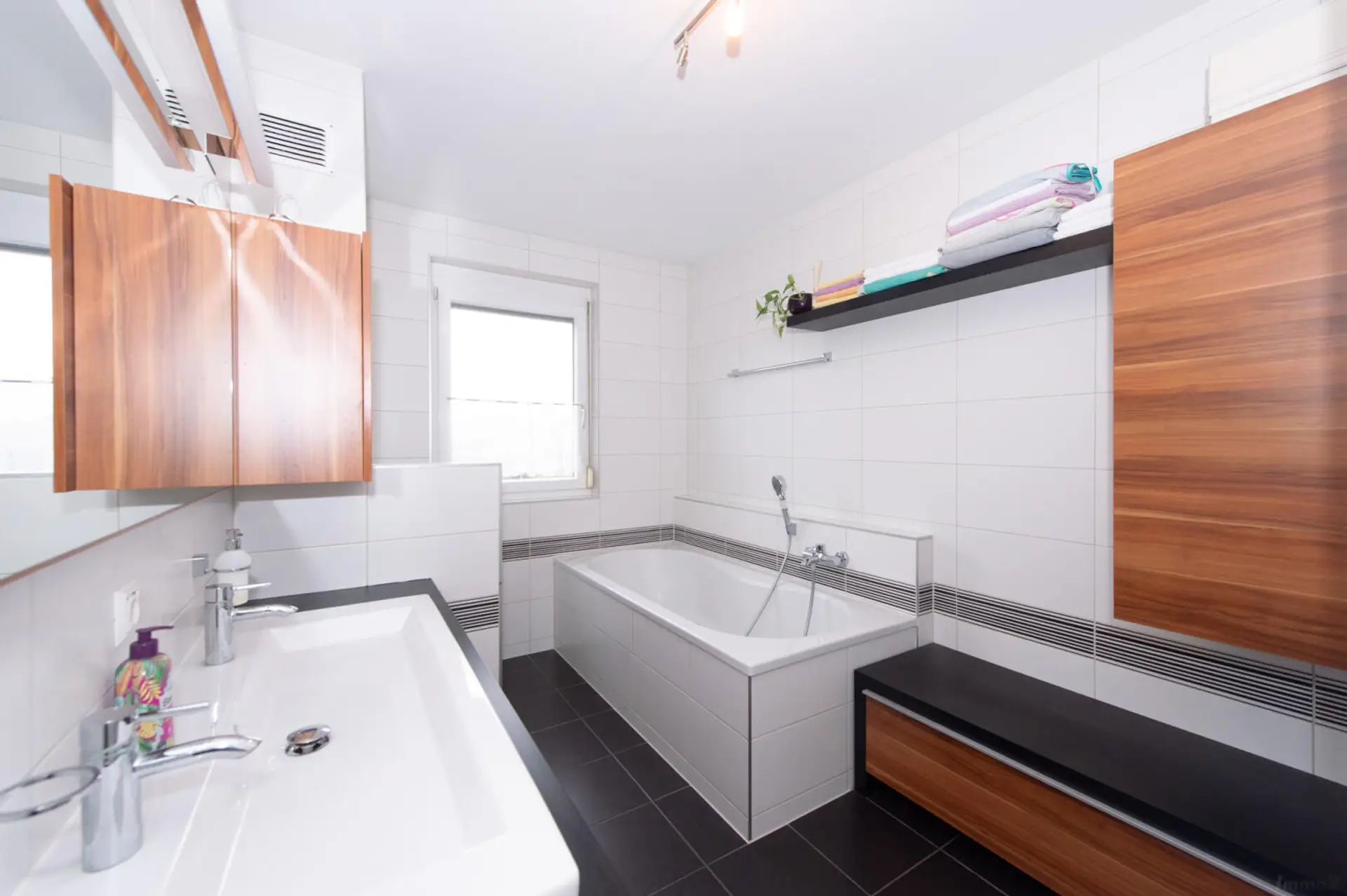 Im Obergeschoss erwarten Sie drei getrennt begehbare Schlafzimmer. Das großzügige Tageslichtbad ist mit Badewanne, Dusche und WC ausgestattet und bietet ausreichend Platz für die gesamte Familie.