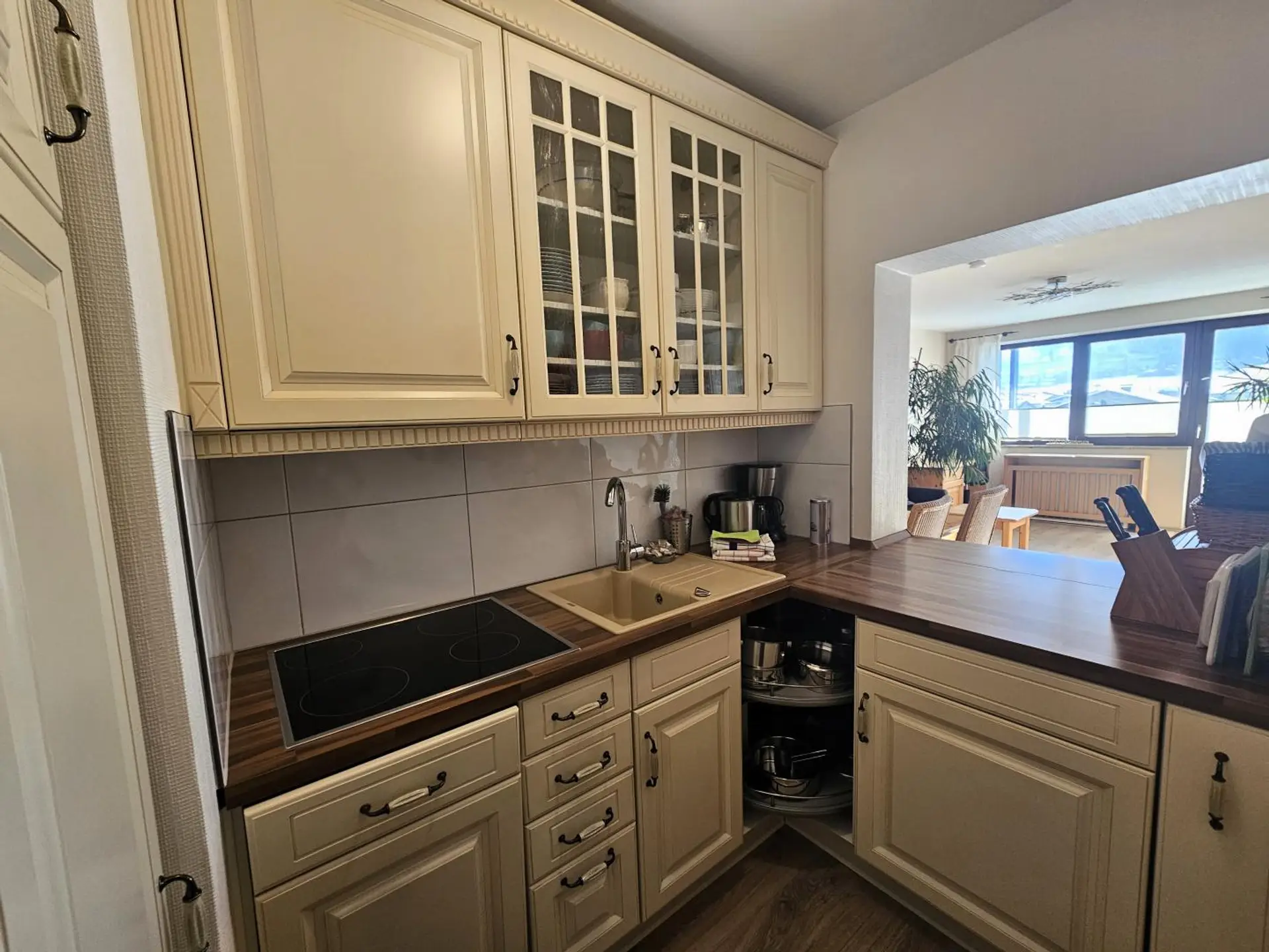 With a living area of approx. 53 m², the apartment offers a bright and welcoming living atmosphere. The spacious living room with dining area provides direct access to the sunny balcony of approx. 15 m², offering magnificent views of the surrounding mountains. The kitchen, featuring a practical serving hatch, combines functionality with a sociable layout.