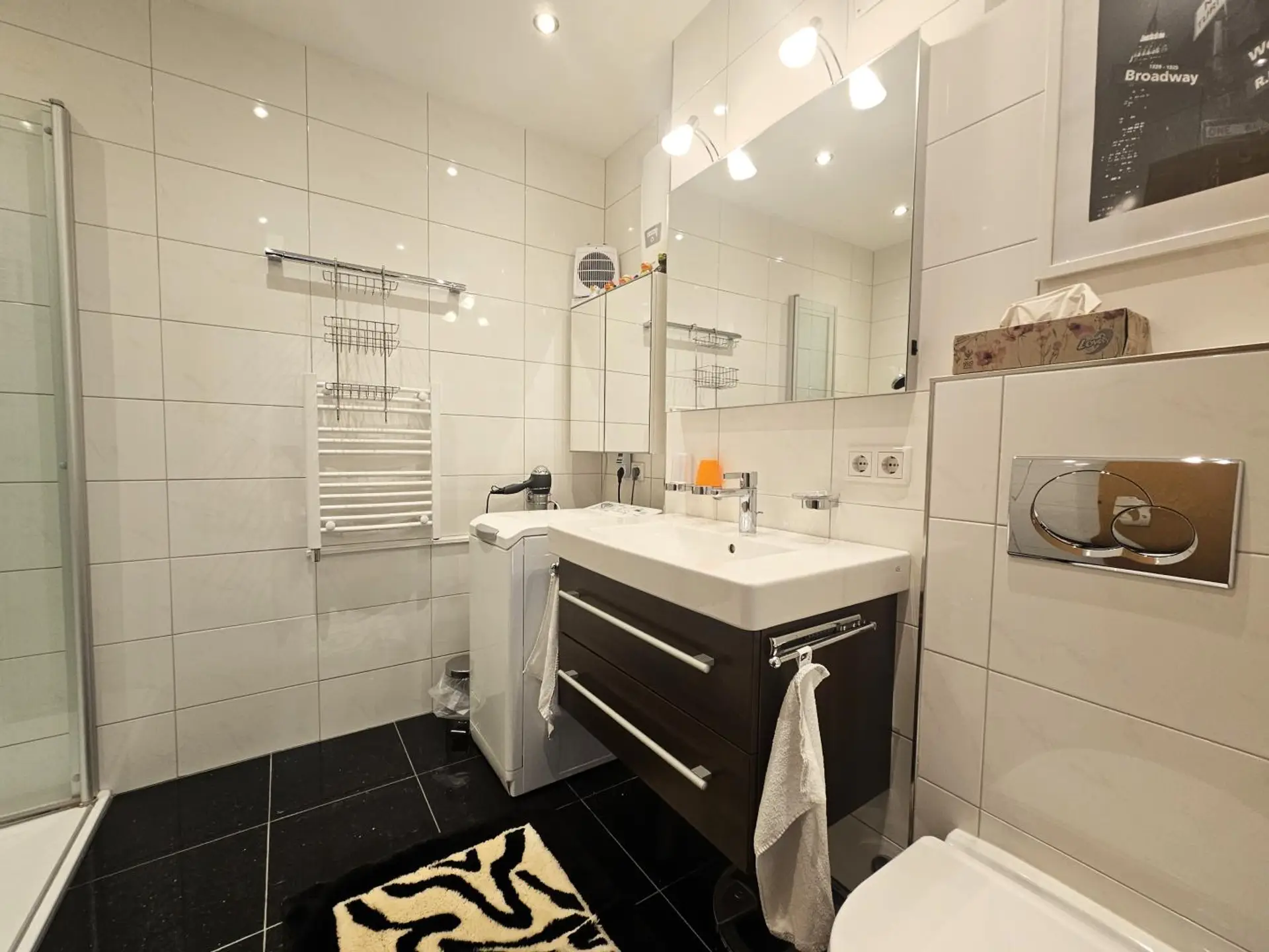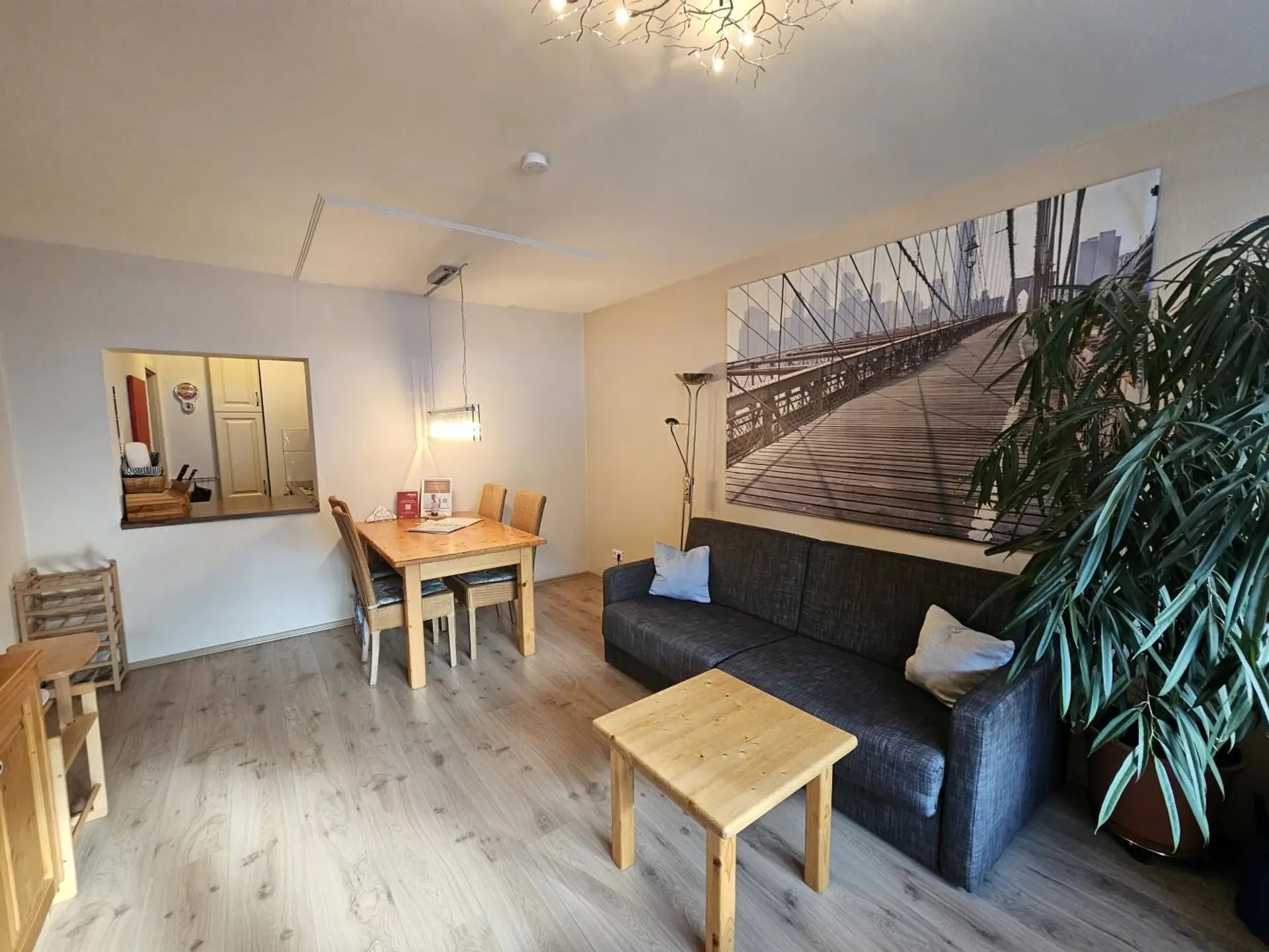 The bedroom, also with access to the balcony, invites restful nights. The bathroom is equipped with a shower, underfloor heating, and a washing machine connection. A friendly entrance hall completes the space on offer.