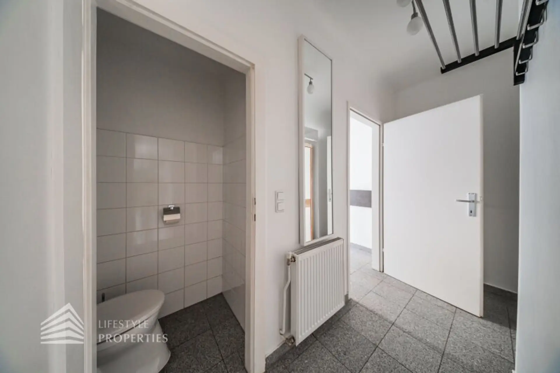 Sie betreten die Wohnung und befinden sich im Vorraum. Linkerhand gelangen Sie in den Wohn- Schlafraum. Des Weiteren gelangen Sie vom Vorraum in die voll ausgestattete Küche und in das Bad mit Fenster. Dieses ist mit einer Dusche und einem Waschbecken ausgestattet. Das separate WC ist auch vom Vorraum erreichbar.