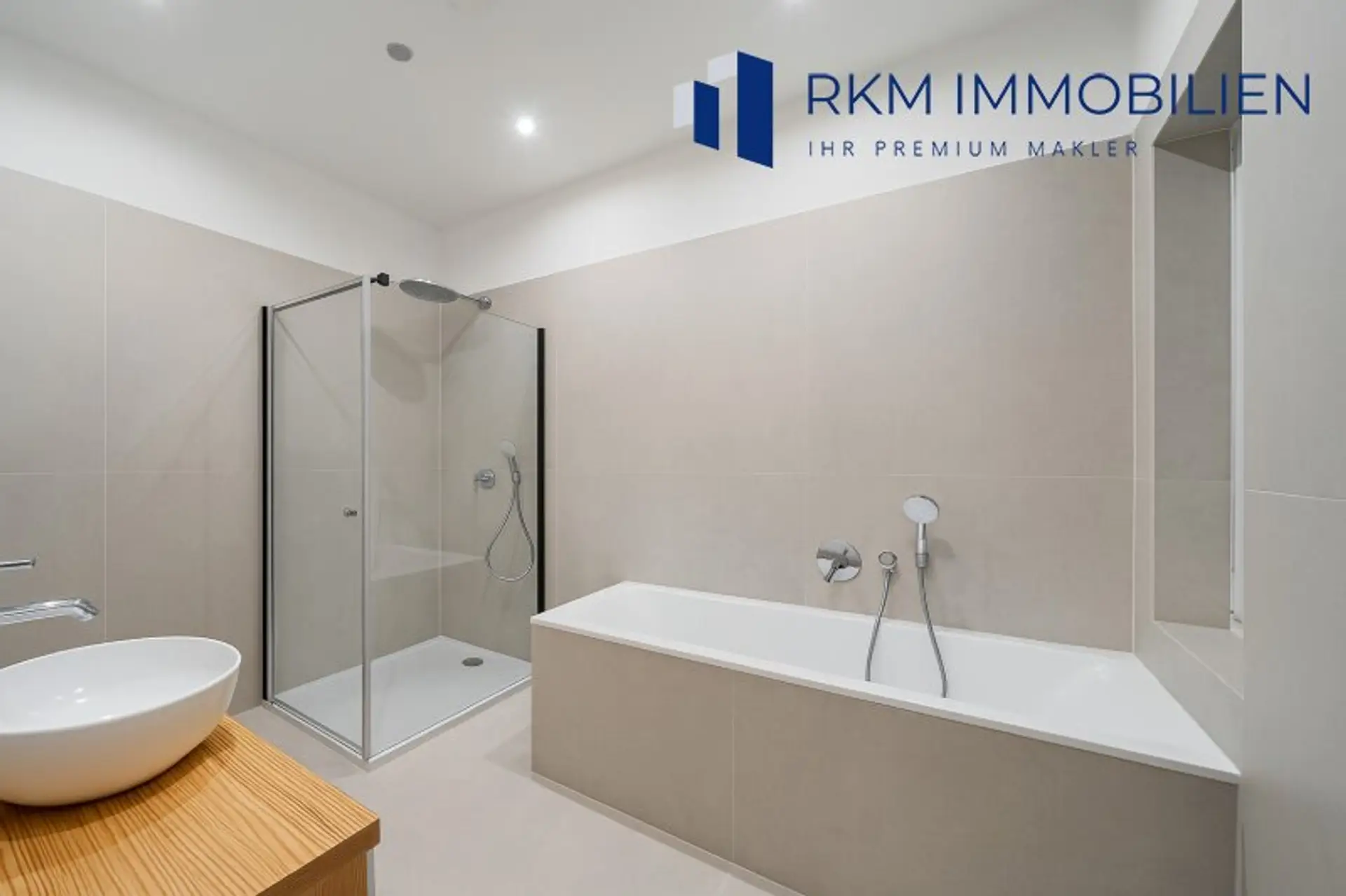Badezimmer mit Badewanne, Dusche und Markenarmaturen