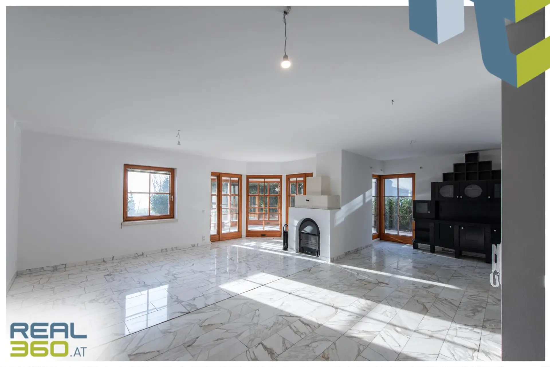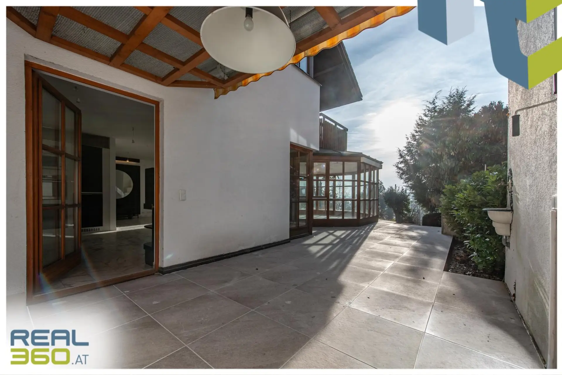 Repräsentativer Wohnbereich mit offener Küche, Essplatz und angrenzendem Wohnzimmer samt offenem Kamin, direktem Zugang zu Wintergarten und Terrasse. Drei Schlafzimmer sowie ein separates Büro mit Vorraum/Garderobe (ca. 40 m²), ideal für Homeoffice oder geschäftliche Nutzung. Darüber hinaus steht noch ein Keller mit Sauna und Weinkeller samt Sitzgelegenheiten für gesellige Genussmomente zur Verfügung. Mehreren Balkonen und Terrassen, strukturierte Gartenflächen, teils überdacht, Außendusche sowie Biotop runden das Angebot im Außenbereich ab!