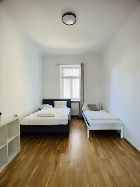 Die Wohnung befindet sich im Erdgeschoss eines gepflegten Hauses aus dem 19. Jahrhundert, mit insgesamt drei Stockwerken. Sie wurde umfassend saniert und bietet durch hochwertigen Eichenparkettboden, mehrfachverglaste Fenster sowie eine moderne, neu eingebaute Küche ein angenehmes und zeitgemäßes Wohnambiente. Wohnzimmer, Küche sowie eines der Schlafzimmer sind straßenseitig ausgerichtet, während sich das zweite Schlafzimmer gartenseitig befindet und dadurch eine angenehm ruhige Schlaf- oder Arbeitsatmosphäre bietet.