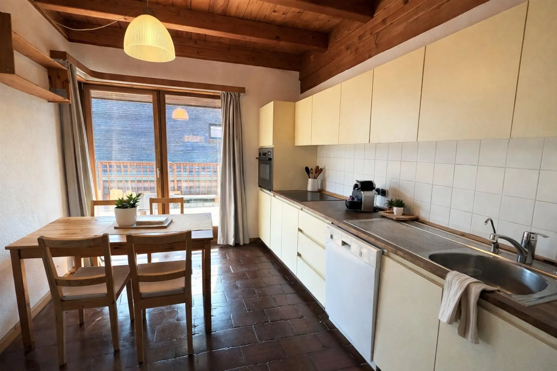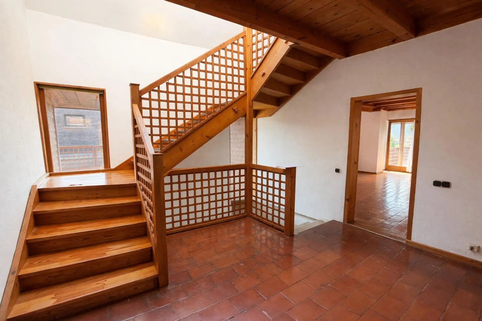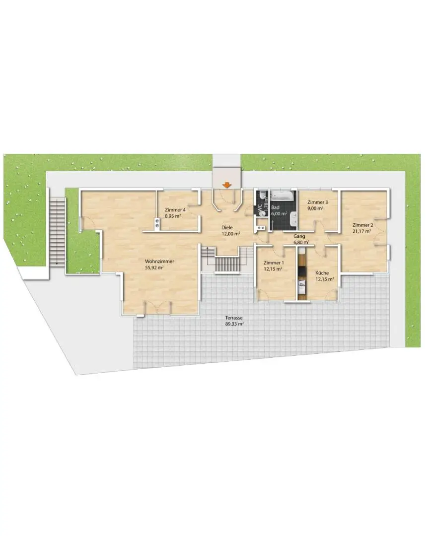 Das Highlight dieser Ebene ist, dass man von der Küche, dem Wohnzimmer und den beiden Schlafzimmern auf die Terrasse gelangt.