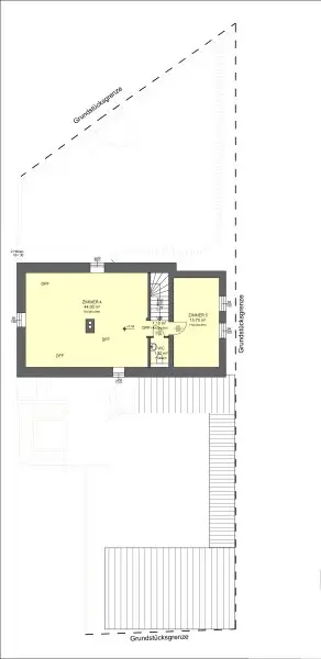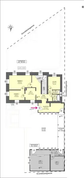 Der Zugang erfolgt südseitig über den Vorplatz mit 4 PKW-Parkplätzen ins Erdgeschoß, welches derzeit als Praxis genützt wird. Hier liegen, vom zentralen Vorraum ausgehend, das auch als Wartebereich dienen kann, ein ostseitiges Zimmer mit Abstellraum, wo sich derzeit ein Server befindet. Ein separates WC ist, auch in Hinblick auf eventuellen Kundenkontakt, vorhanden.