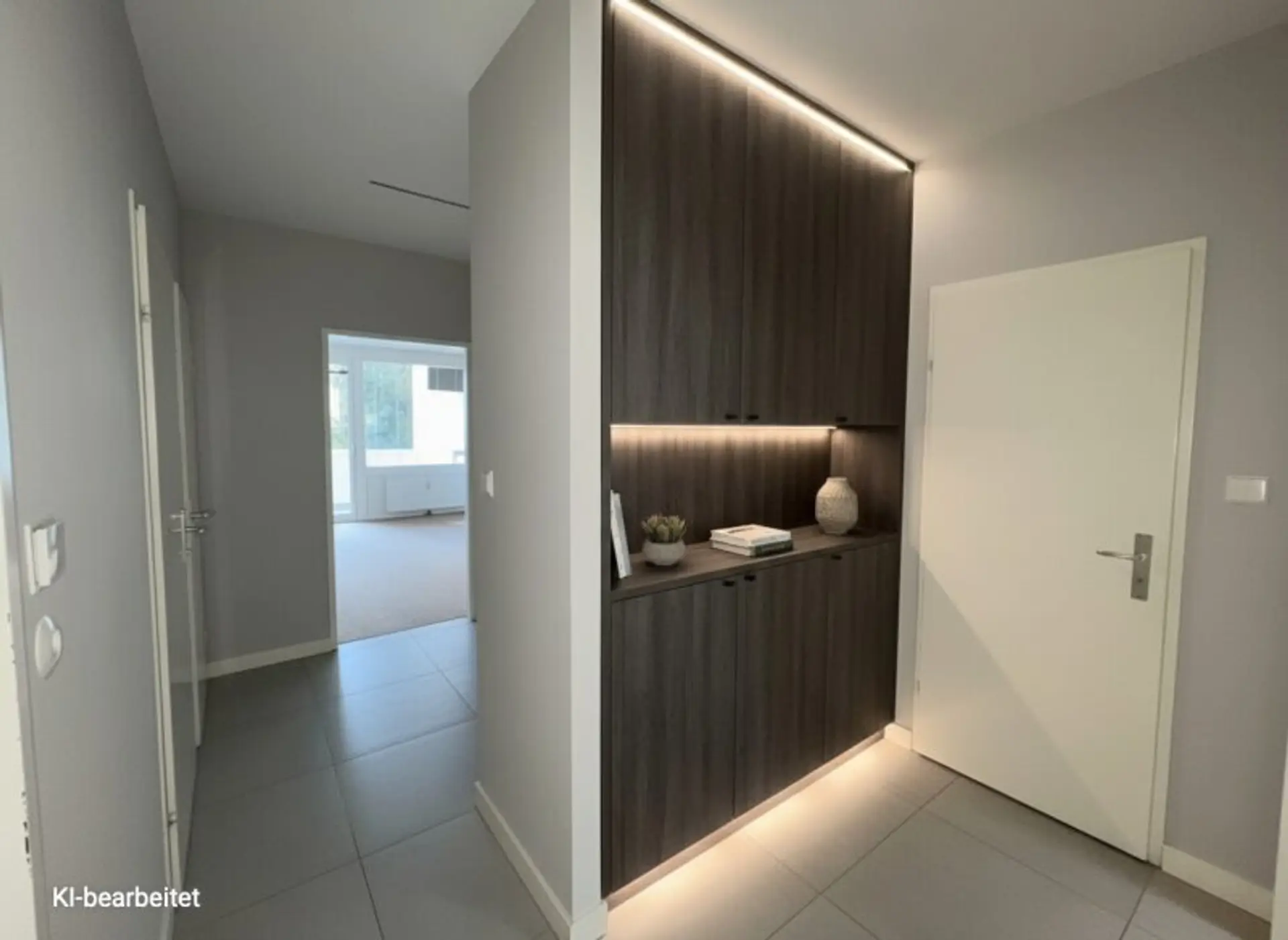 Bereits beim Betreten zeigt sich der klare, gut strukturierte Grundriss, der eine Vielzahl an Gestaltungsmöglichkeiten bietet. Der offene Wohn- und Küchenbereich bildet das Herzstück der Wohnung – ein großzügiger Raum, der zu kulinarischen Momenten, geselligem Beisammensein und entspannten Stunden einlädt. Von hier aus gelangen Sie auf die einladende Loggia, die einen harmonischen Blick ins Grüne freigibt und ein Gefühl von Naturverbundenheit vermittelt.
