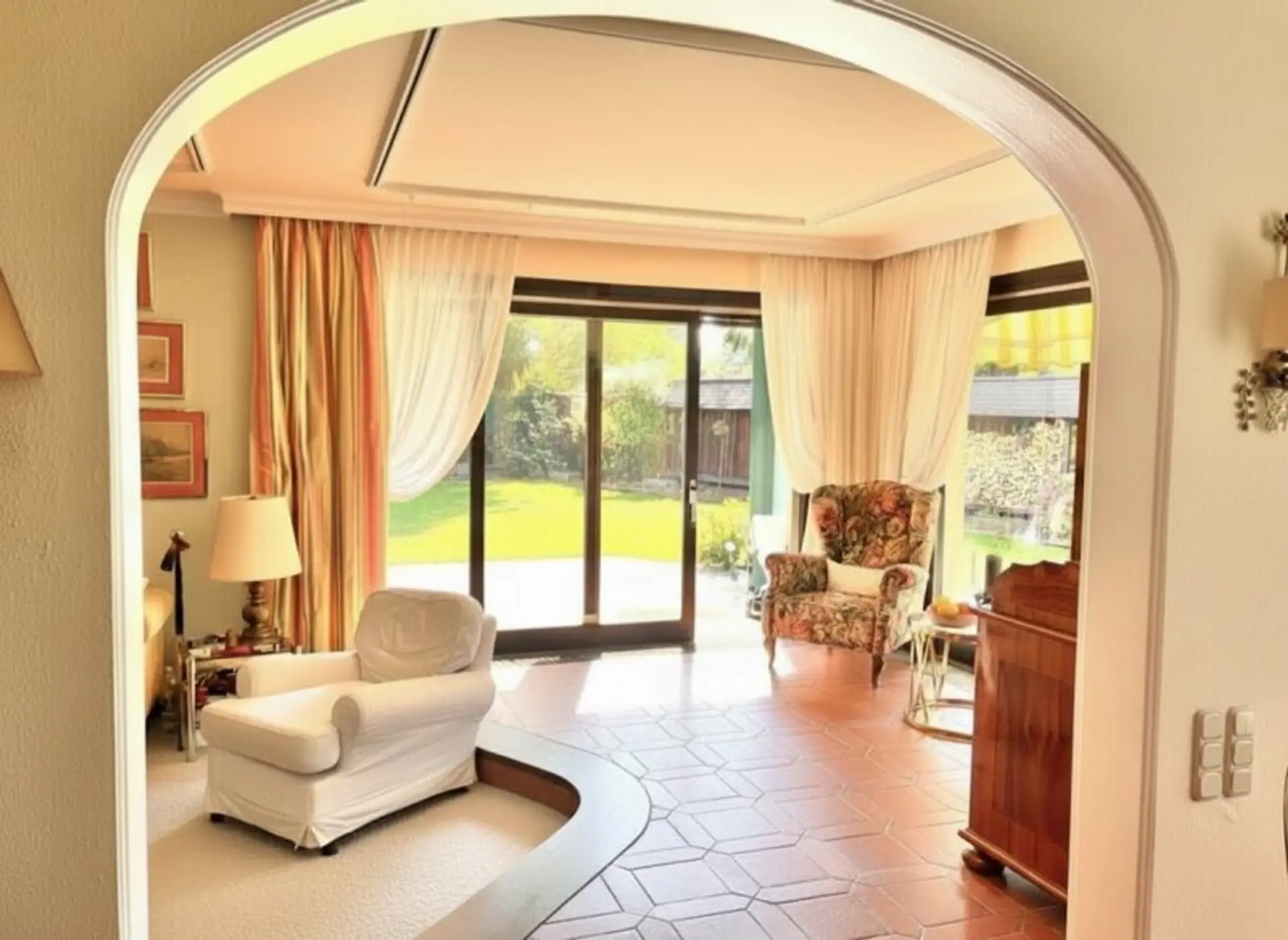 Herzstück des Hauses ist der großzügige, offene Wohn- und Essbereich im Erdgeschoß, der viel Licht und ein angenehmes Wohngefühl vermittelt. Der Cotto-Bodenbelag (Terrakotta) verleiht dem Raum eine warme, mediterrane Atmosphäre. Ein wunderschöner Kachelofen sorgt in den Wintermonaten für kuschelige Wohlfühlmomente. Die Küche ist separat gehalten und durch eine praktische Durchreiche mit dem Essbereich verbunden – ideal für den Alltag und Gäste. Große Glasfronten schenken dem Wohnbereich viel Licht und führen auf die großzügige Terrasse, die nahtlos in den gepflegten süd-westlich ausgerichteten Garten übergeht – wo ein separates überdachtes Salettl zum Entspannen in der Abendsonne einlädt.