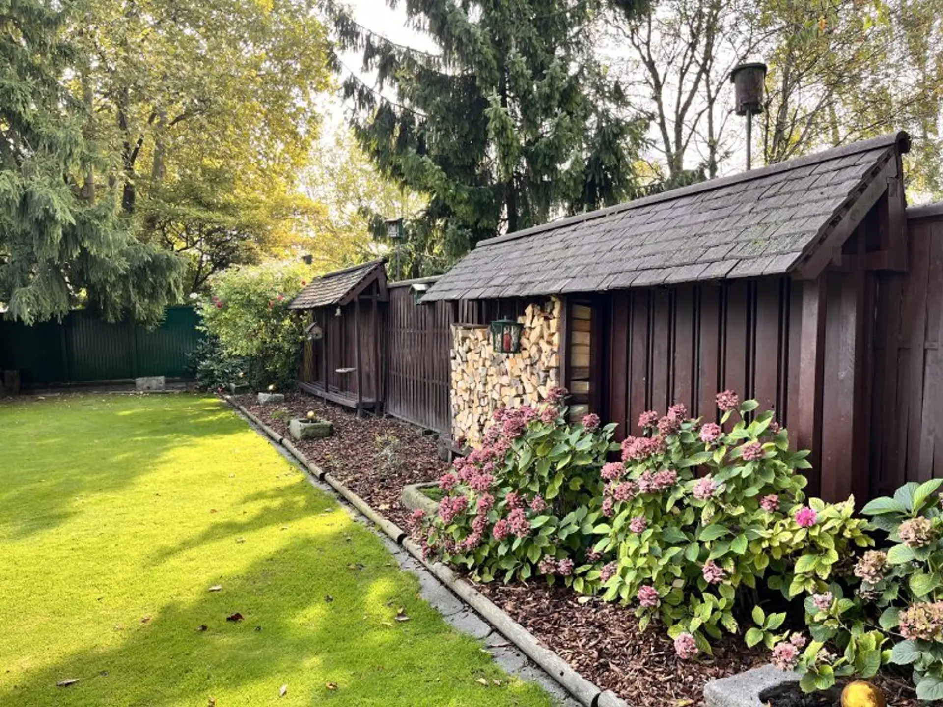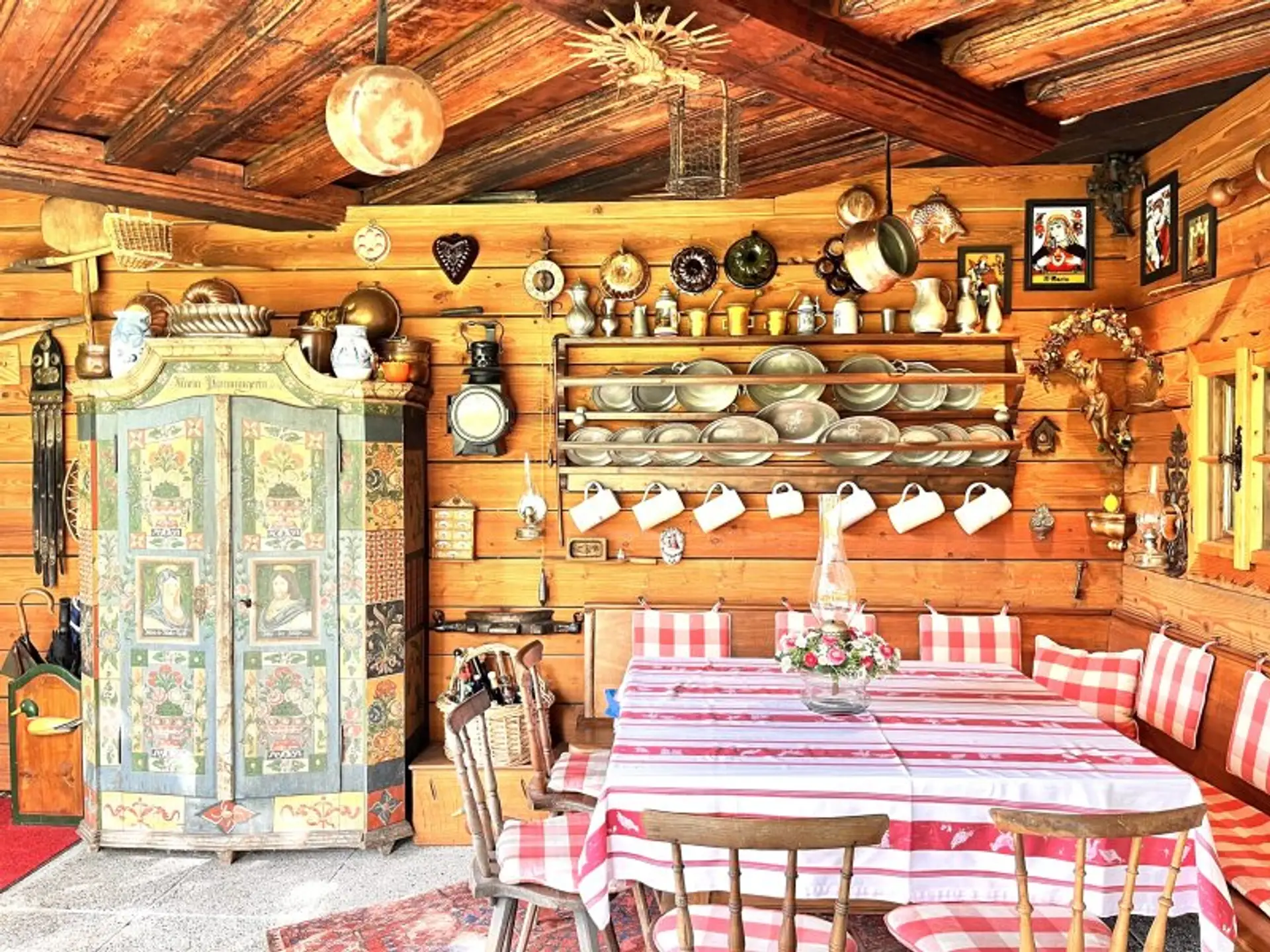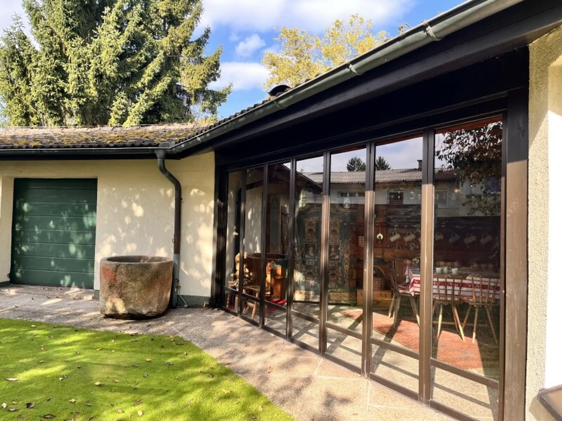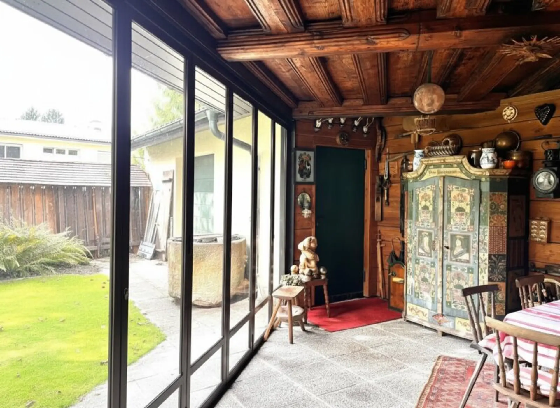 Ein besonderes Highlight ist die urig ausgebaute Bauernstube, die direkt an den Wohnbereich angrenzt und deren Glas-Schiebe-Wand zum Garten gänzlich geöffnet werden kann. Sie lädt zum gemütlichen Beisammensitzen samt herrlichen Blick in den gepflegten Garten ein.