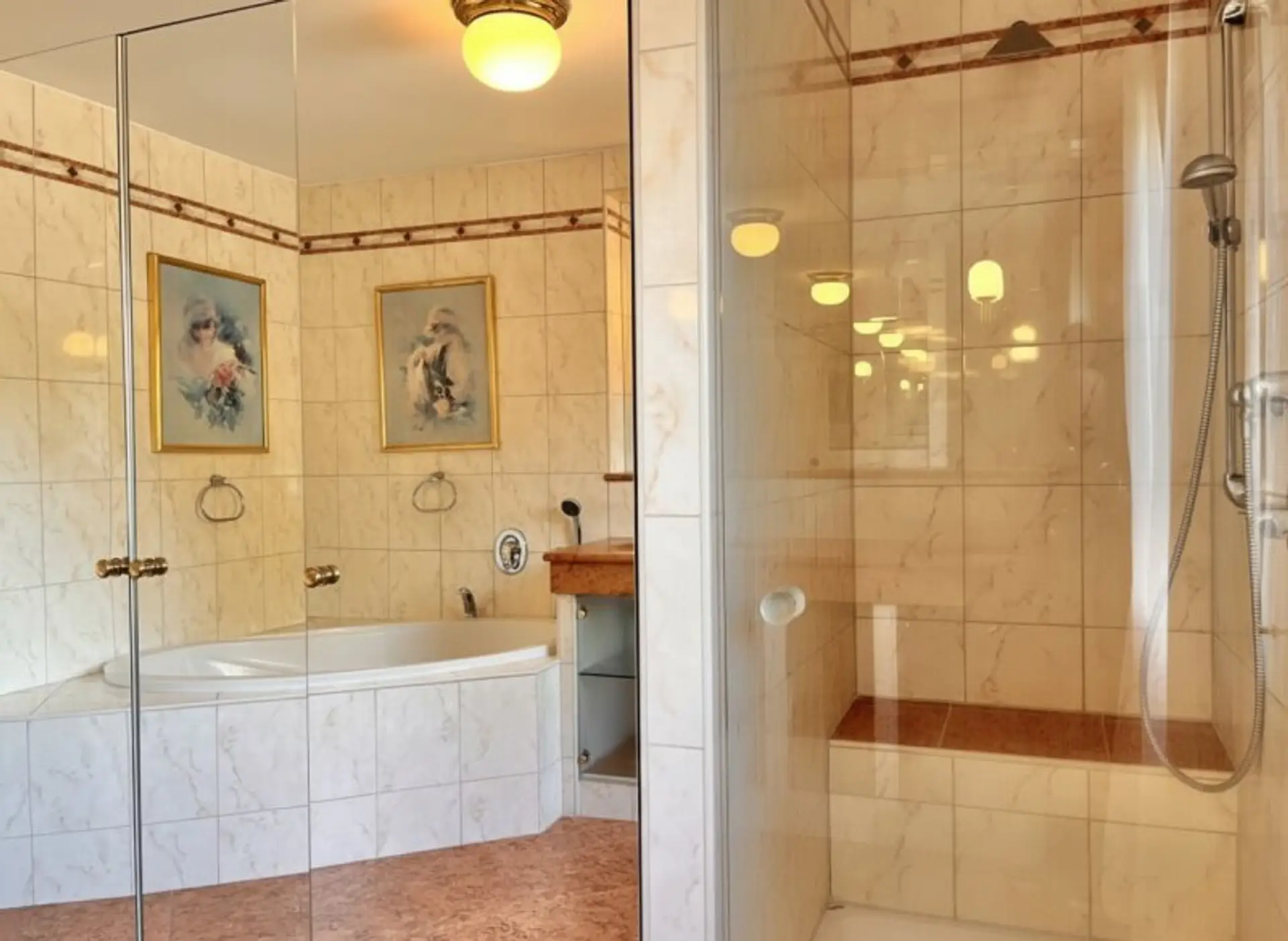 Im 1.Stock befinden sich eine Ankleide (ca. 8 m2), ein Badezimmer mit Badewanne & Dusche (ca. 11 m2), ein separates WC sowie die Schlafräume. Aus ursprünglich drei Zimmern wurden zwei großzügige Schlafzimmer mit ca. 27 m² und ca. 13 m² geschaffen. Der Grundriss (3 Räume zu je 13 m2) kann bei Bedarf jederzeit wiederhergestellt werden. Ein großer Balkon mit 14 m2 und Blick in den Garten erstreckt sich über die beiden zusammengelegten Räumen (ursprünglich eine Balkontür pro Zimmer).