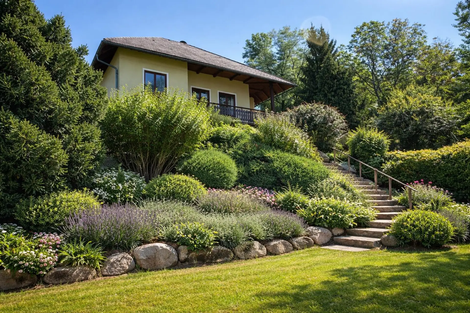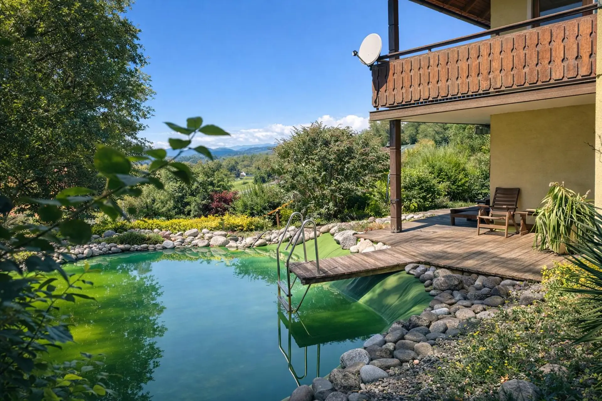 Das rund 1.200 m² große Grundstück überzeugt mit altem Baumbestand, liebevoll angelegten Grünflächen, gemütlichen Sitzplätzen und einem idyllischen Schwimmteich. Die asphaltierte Zufahrt ist ganzjährig befahrbar, das Grundstück ist weitgehend eingefriedet und bietet viel Ruhe.