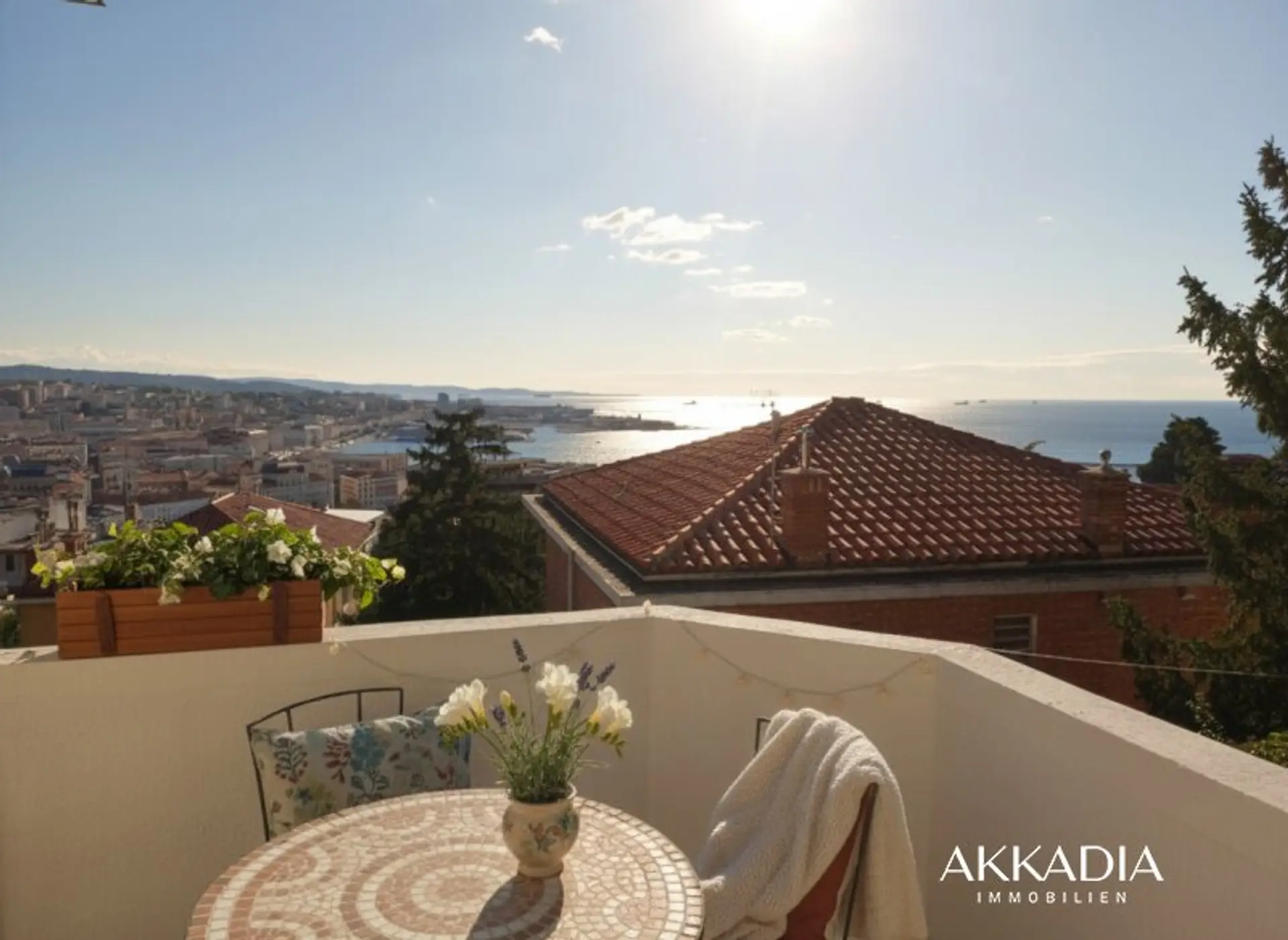 Im Erdgeschoss empfängt ein großzügiger, heller Wohnsalon, der sich ideal zum Einladen von Gästen eignet, eine große Wohnküche mit warmer, gemütlicher Atmosphäre sowie ein Gästebad. Das Obergeschoss bildet den Schlafbereich mit drei Schlafzimmern, einem zweiten Badezimmer und einer bewohnbaren Terrasse. Von hier aus eröffnet sich ein atemberaubender Panoramablick auf das Meer mit Sicht auf San Giusto, den Molo Audace und die prächtige Piazza Unità d’Italia.