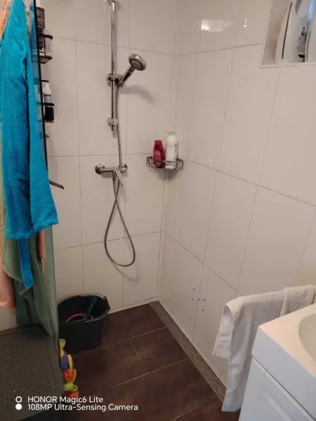 Badezimmer mit bodengleicher Dusche, Waschbecken und Waschmaschinenanschluss