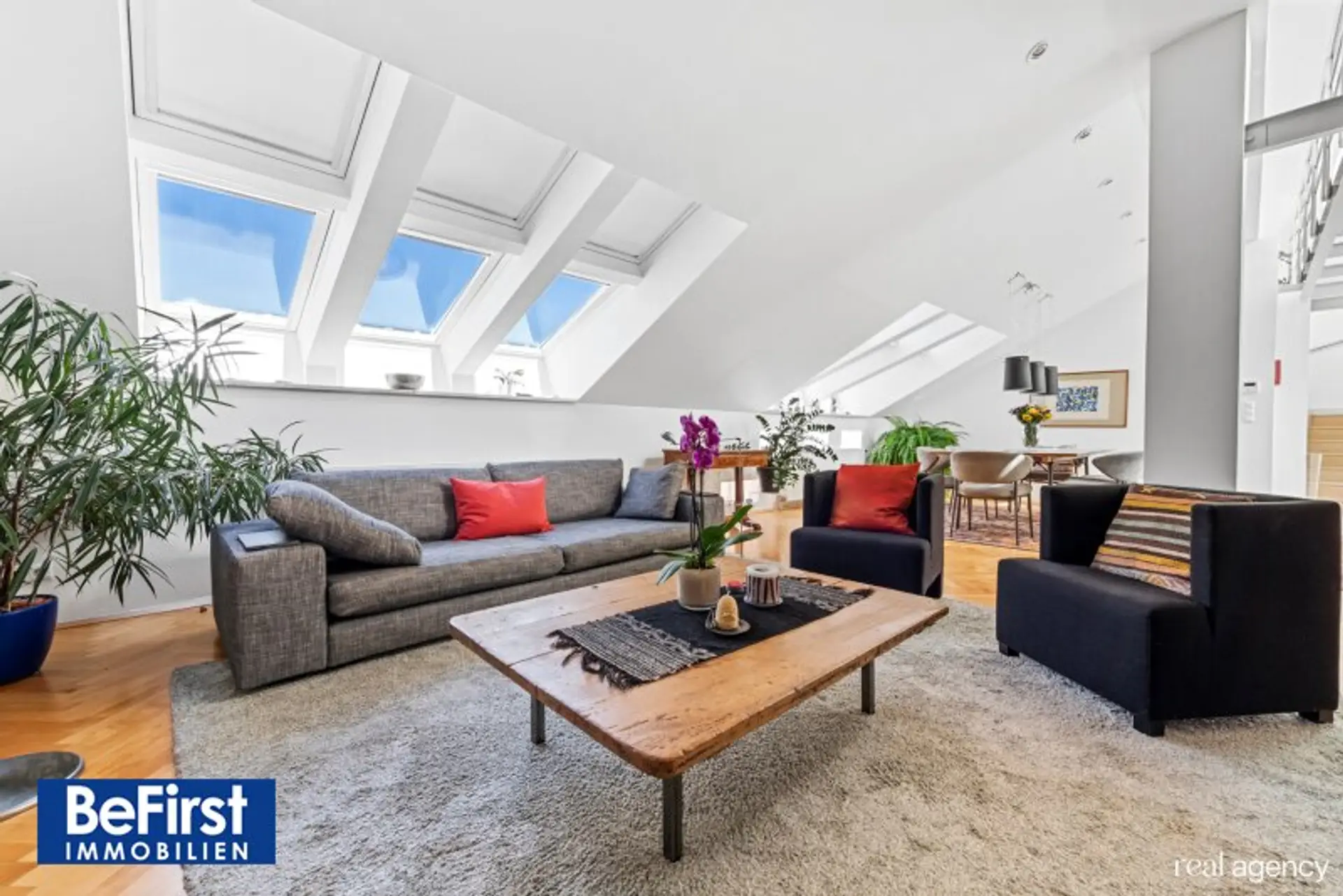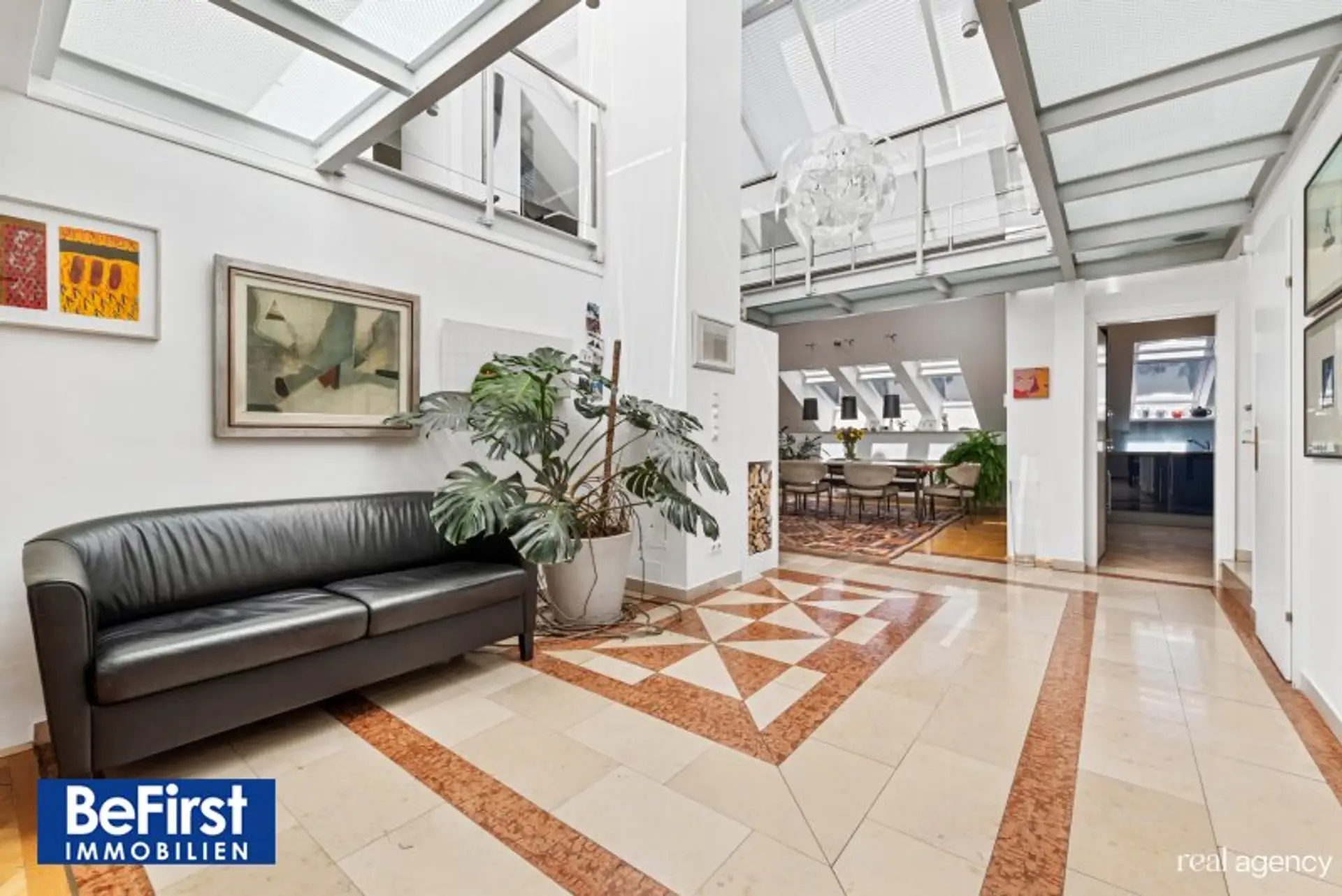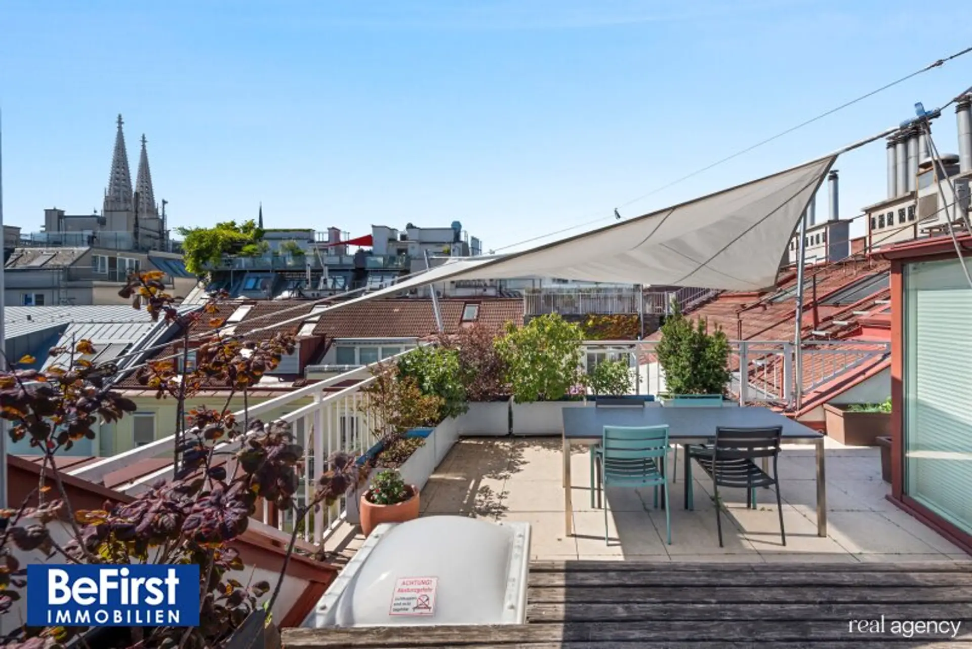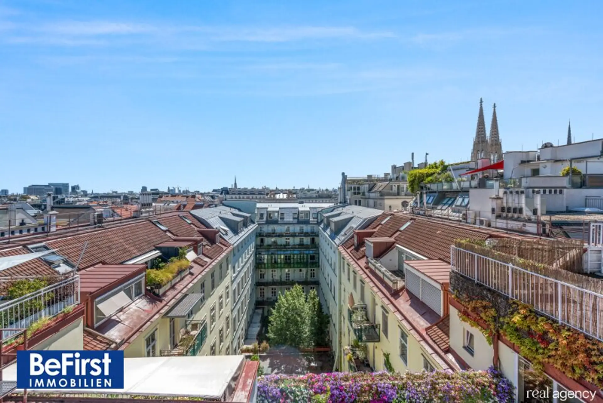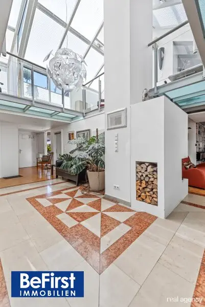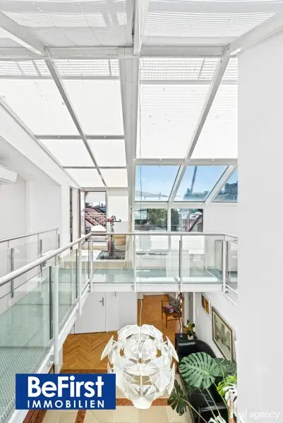 Diese sehr schicke und architektonisch toll gestaltete Dachterrassenwohnung in phantastischer Lage zwischen der Votivkirche und dem Servitenviertel gelegen, besticht neben der modernen und offenen Raumaufteilung allen voran durch zwei ruhig gelegene, herrliche Terrassen. Die Immobilie mit rd. 181m2 Wohnnutzfläche wurde hochwertigst in einem der zauberhaften Gründerzeithäuser am Beginn der Berggasse errichtet. Die Wohnfläche teilt sich in eine erste Ebene mit großzügigem Entree, dem wunderschönen Wohnbereich, einer separaten, lichtdurchfluteten Küche und dem Schlafzimmer mit einem angeschlossenen Badezimmer sowie der in einen hübschen, sonnendurchfluteten Innenhof ausgerichteten rd.16m2 großen Terrasse. Eine Garderobe, ein weitere Abstell- und Wirtschaftsraum etc. zählen zudem zu der perfekt gestalteten Immobilie und geben ausreichend Stauraum. Die Decke im Eingangsbereich reicht durchgehend bis ins Obergeschoss und bietet damit in beiden Ebenen viel Licht und Helligkeit. Auch im OG zeigt sich die harmonische Planung. Eine nach beiden Seiten offene, verglaste Galerie dient als verbindendes Element zu einem Kinder-/Gästezimmer, einem Arbeitsbereich und einem weiteren Bad mit Dusche/WC sowie der herrlichen 20m2 großen zweiten Terrasse, die ebenfalls in den Innenhof ausgerichtet ist. Beheizt wird über Fußbodenheizung und Radiatoren mit Gas oder über den wunderschönen, offenen Kamin im Wohnbereich. Alle Veluxfenster verfügen über Innen- und Außenbeschattung. Die Kühlung erfolgt über Klimageräte.