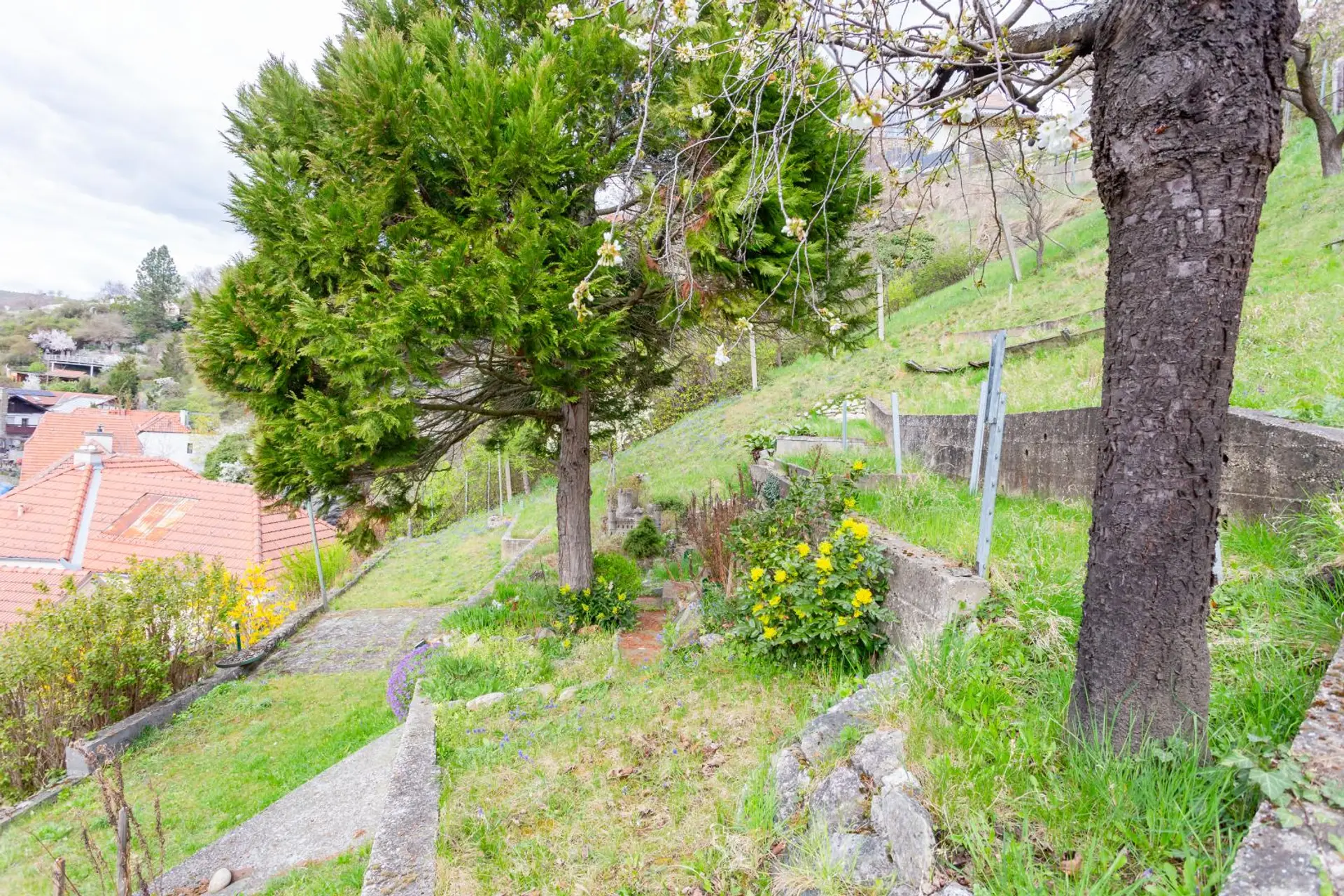 Der hinter dem Haus liegende Hauptgarten mit Altbaumbestand, Grünflächen und Sträuchern ist aufgrund der Steilheit des Geländes in Terrassen angelegt und über Fußwege zu erschließen.