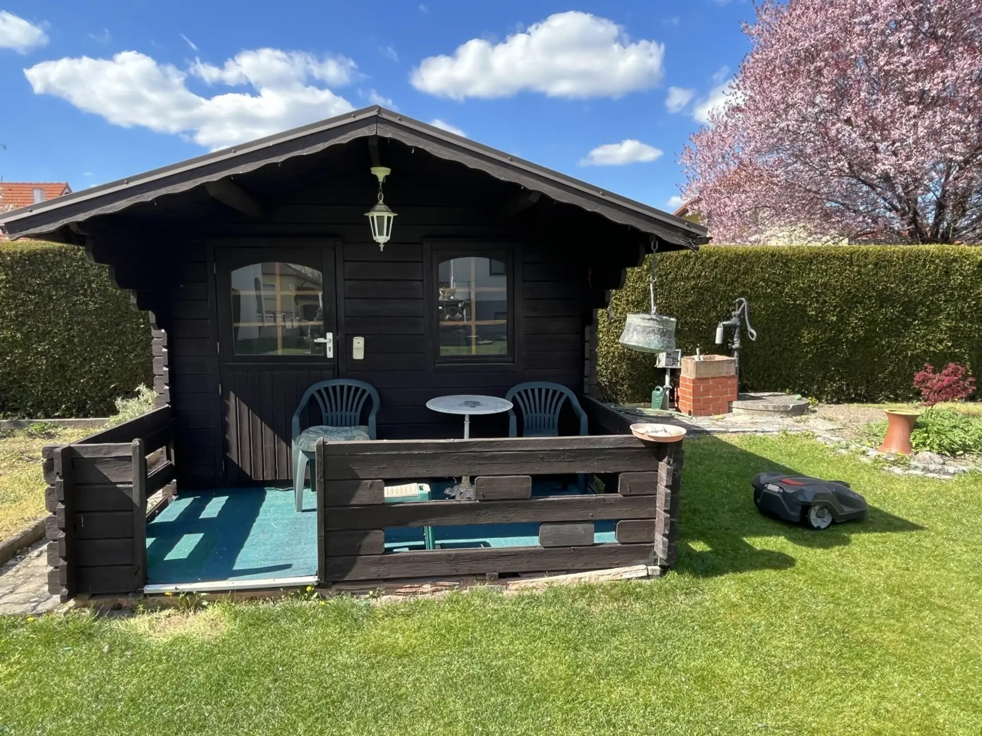 Im Garten befindet sich auch noch ein Gartenhaus und ein Gartengerätehaus. Ein Rasenroboter kümmert sich um die Rasenpflege, die automatische Beregnung sorgt für grünen Rasen.