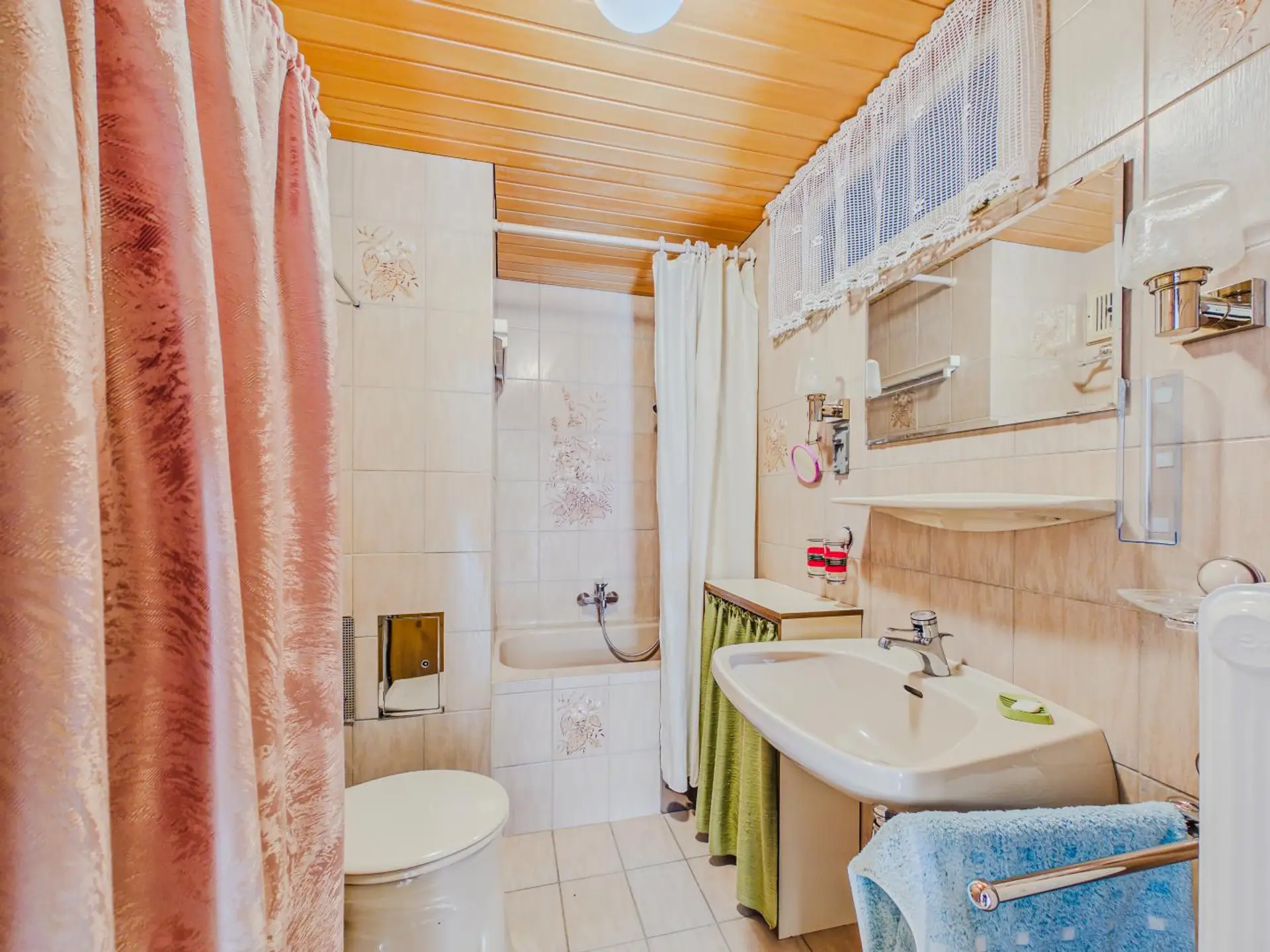 Ein Badezimmer mit Dusche und Badewanne sowie ein separates WC sorgen für zusätzlichen Komfort.