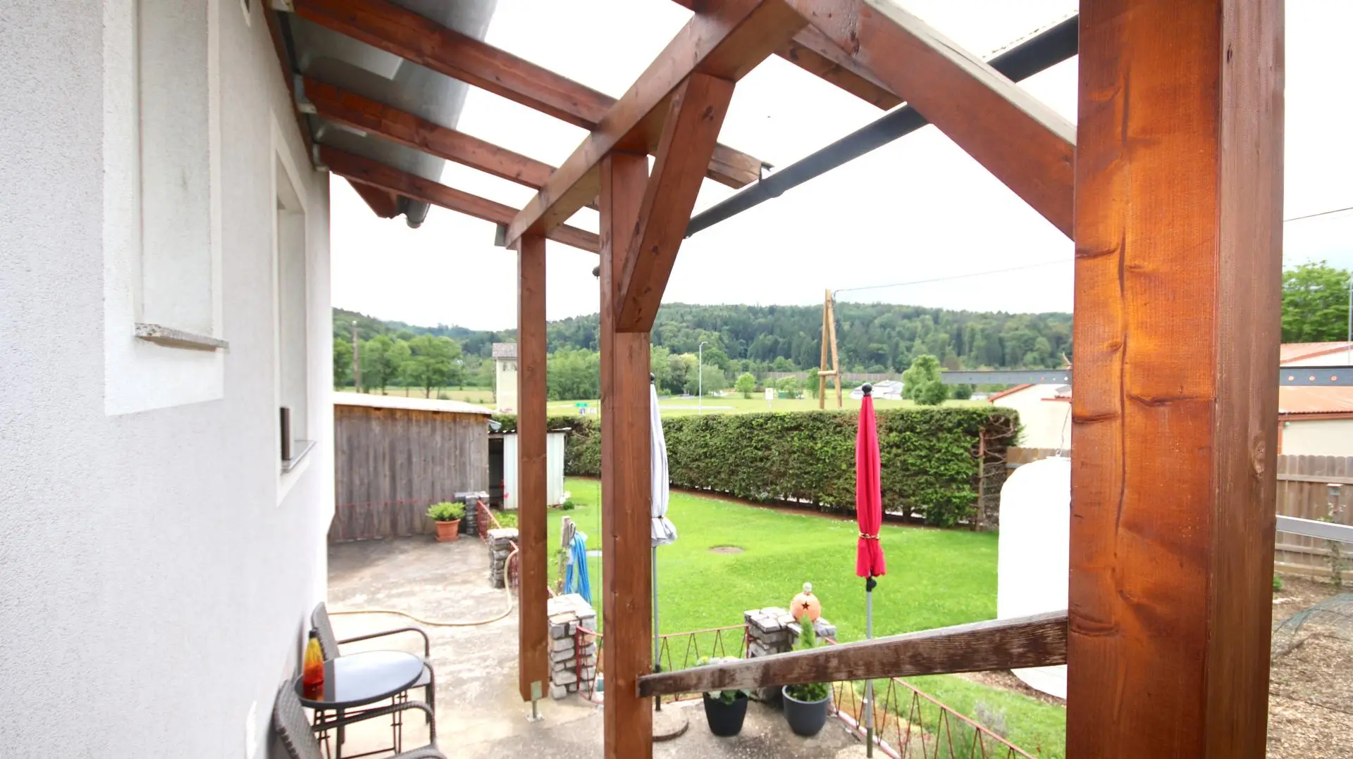 Der Außenbereich besticht durch einen schönen Garten, der sich ideal für die Anlage eines Gemüsegartens eignet. Zusätzlich gibt es eine überdachte Gartensauna, die zu entspannenden Stunden einlädt. Die Zufahrt zum Haus und zur Garage erfolgt bequem über die Hauptstraße.