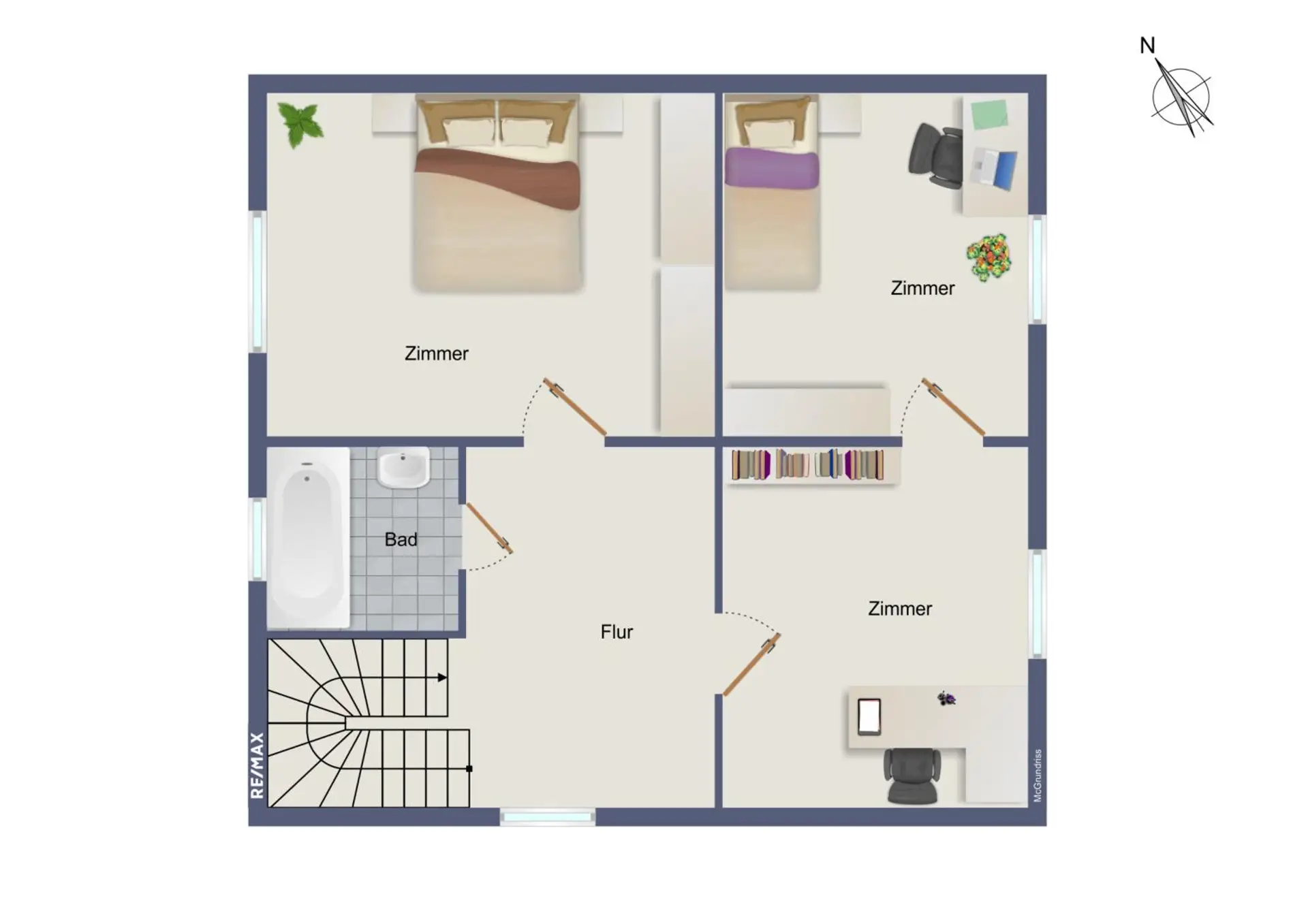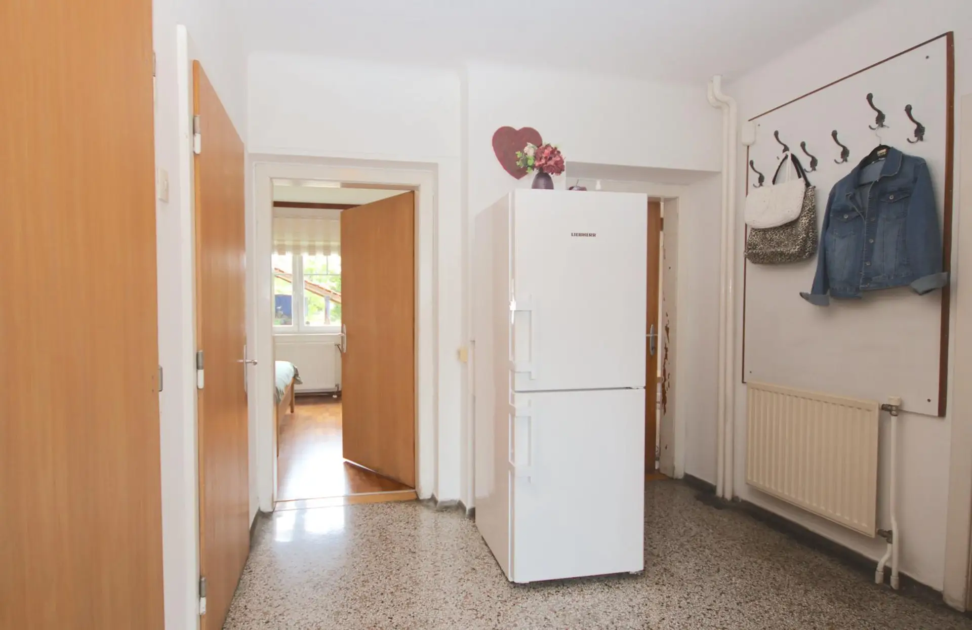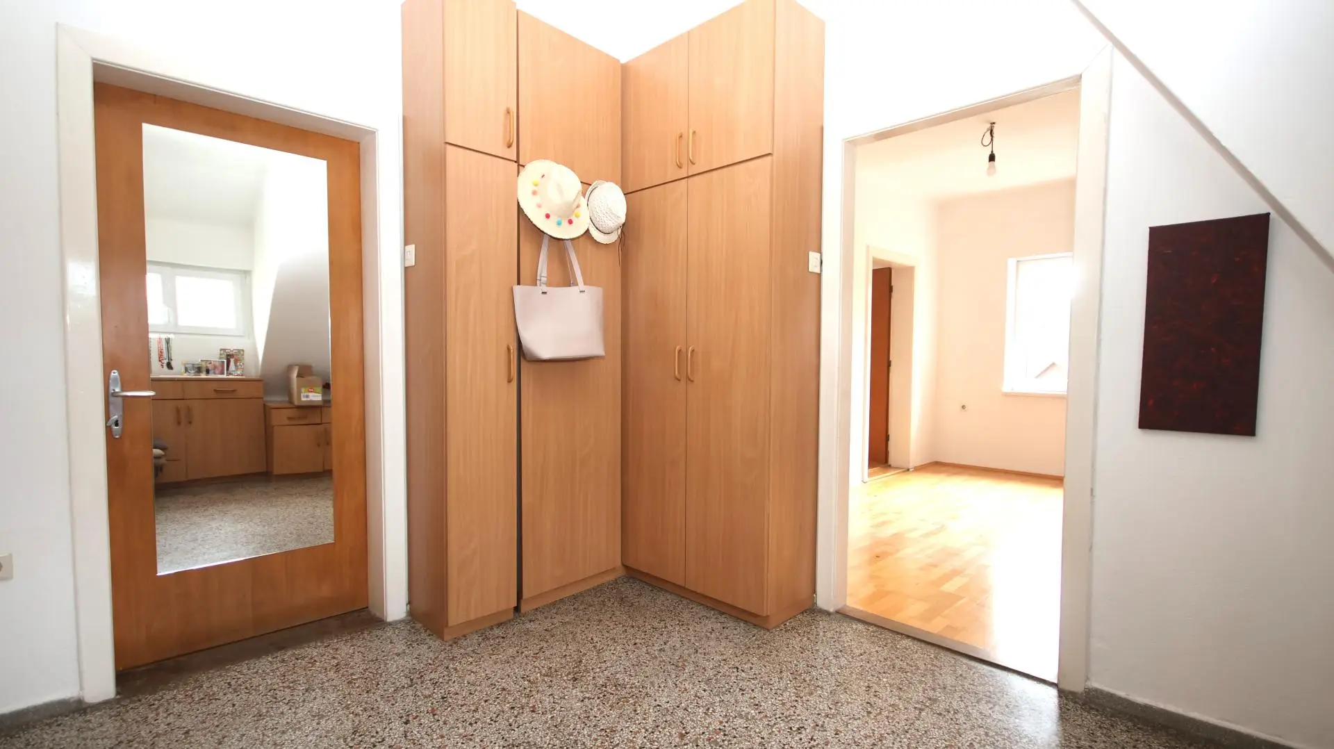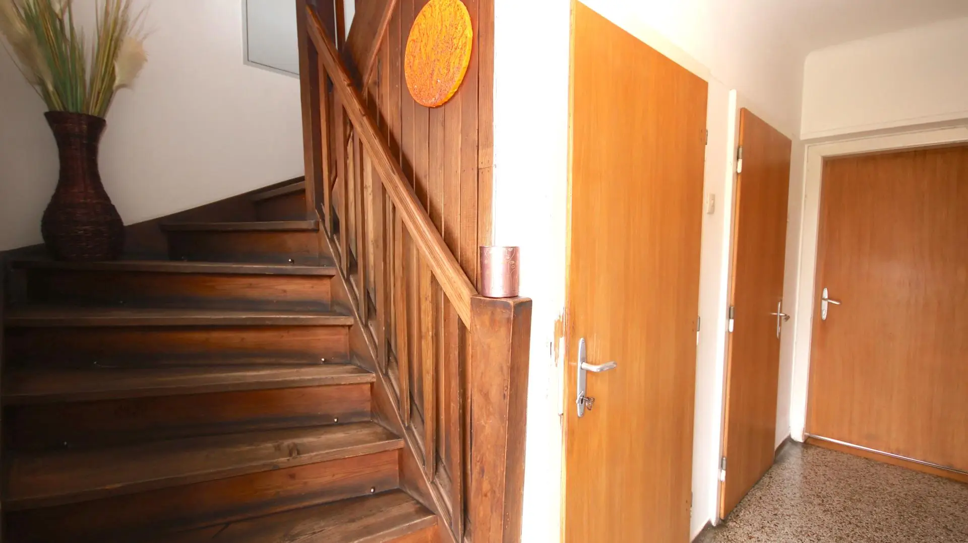 Im Obergeschoss befinden sich drei weitere Zimmer und ein zusätzliches Badezimmer mit Badewanne, die ausreichend Platz für eine Familie bieten.