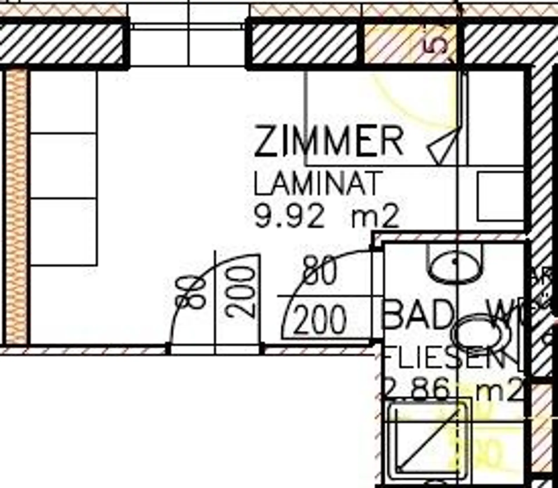 Die Wohnfläche umfasst ca. 12,78 m² und beinhaltet einen Wohn-Schlafbereich sowie ein Badezimmer mit Dusche und WC.