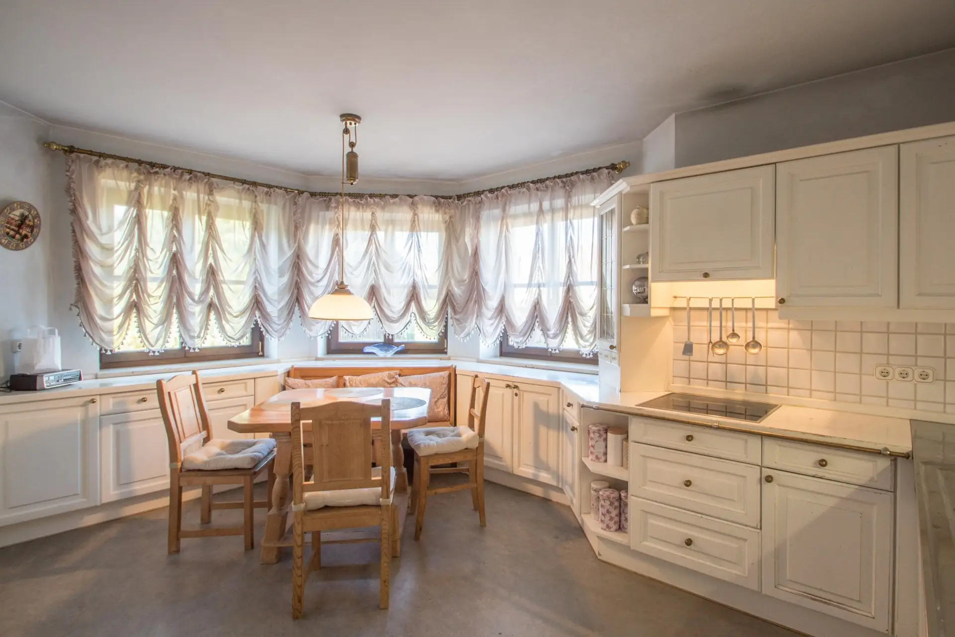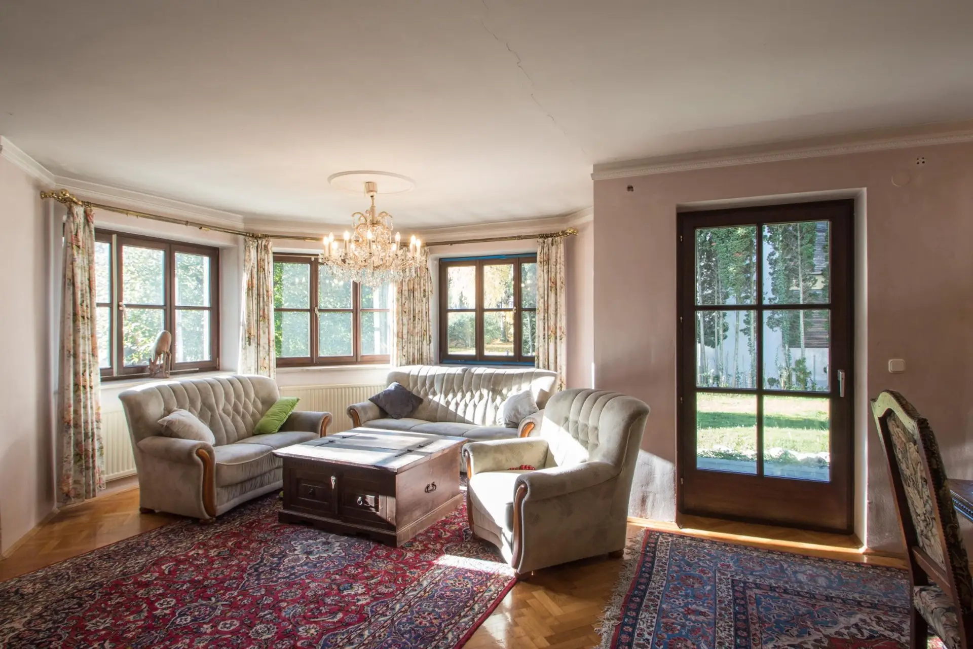 Vom eindrucksvollen Eingangsbereich gelangt man in die gut ausgestattete Küche und in den lichtdurchfluteten Wohn- und Essbereich, der mit einem Kachelofen ausgestattet ist. Von hier aus hat man direkten Zugang zur Terrasse.