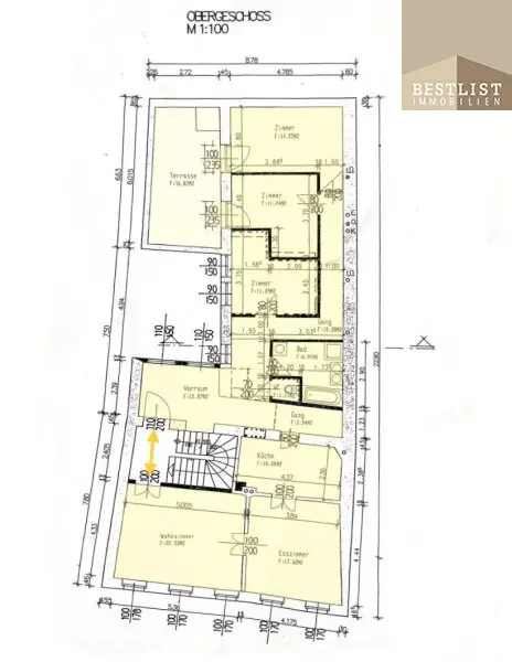 Diese Wohnung befindet sich im Dachgeschoss und verfügt über eine ca. 23 m2 große Terrasse. Die Wohnung hat eine Wohnfläche von ca. 110 m². Die Fläche verteilt sich auf einen Vorraum, ein Wohn-/Esszimmer, eine Küche, ein Bad, ein WC, einen Abstellraum und vier weitere Räume, die vielseitig genutzt werden können.