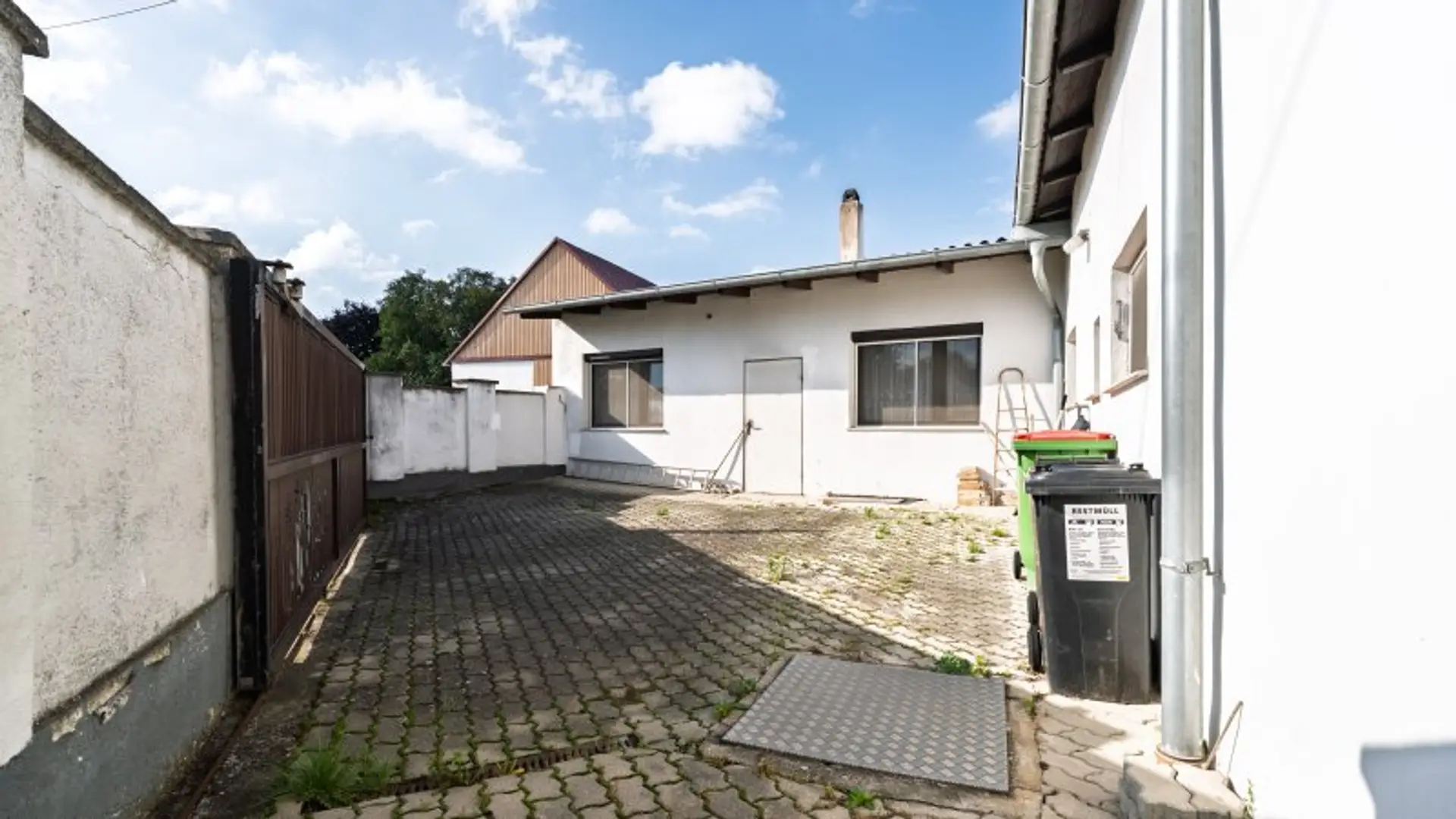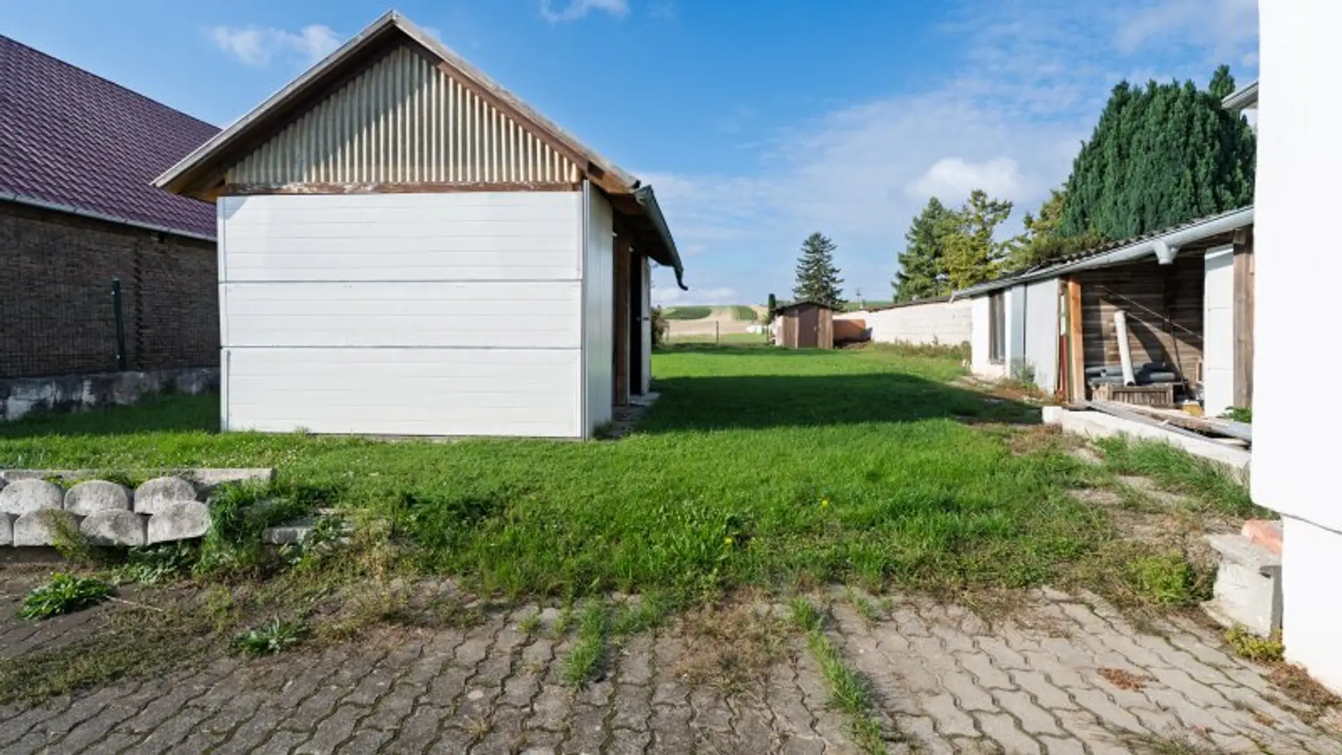 Durch die Werkstatt oder Garage gelangt man in den Innenhof, der zusätzlich über einen kleinen und einen größeren Schuppen verfügt. Hier befindet sich auch der Zugang zur