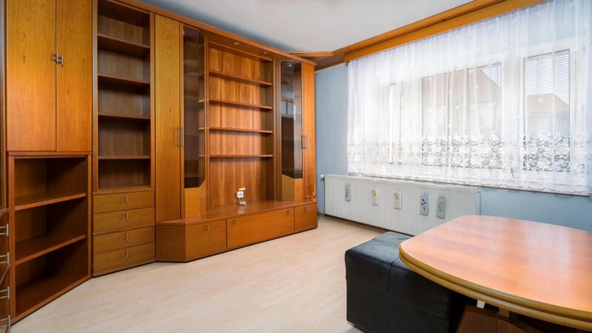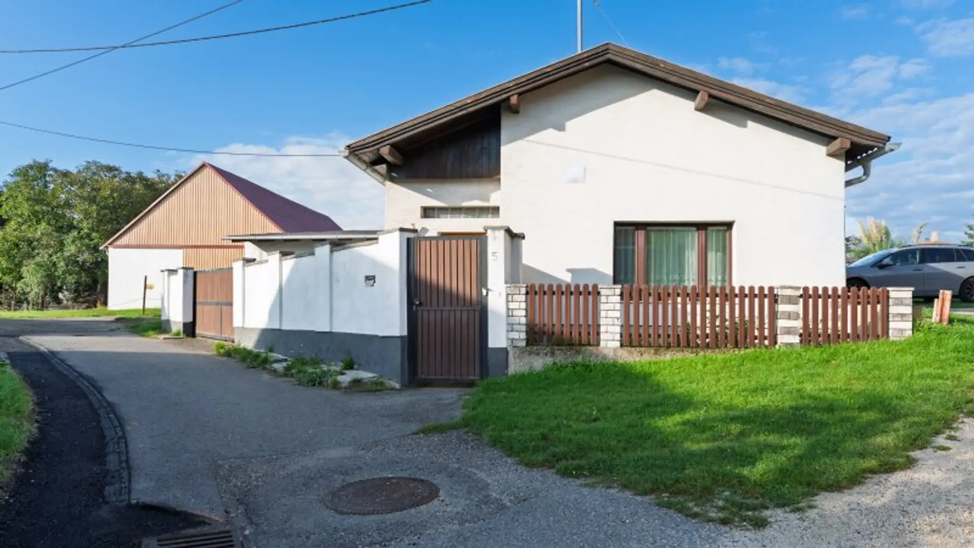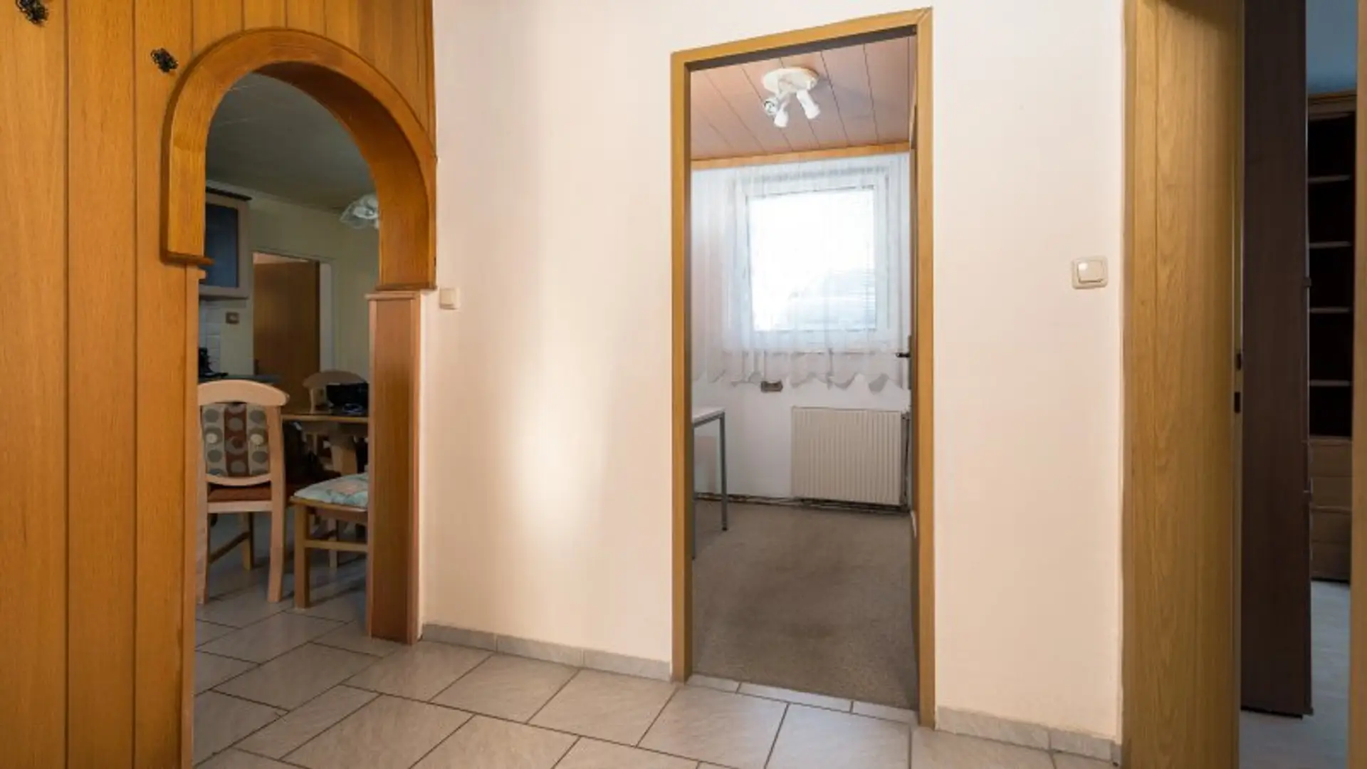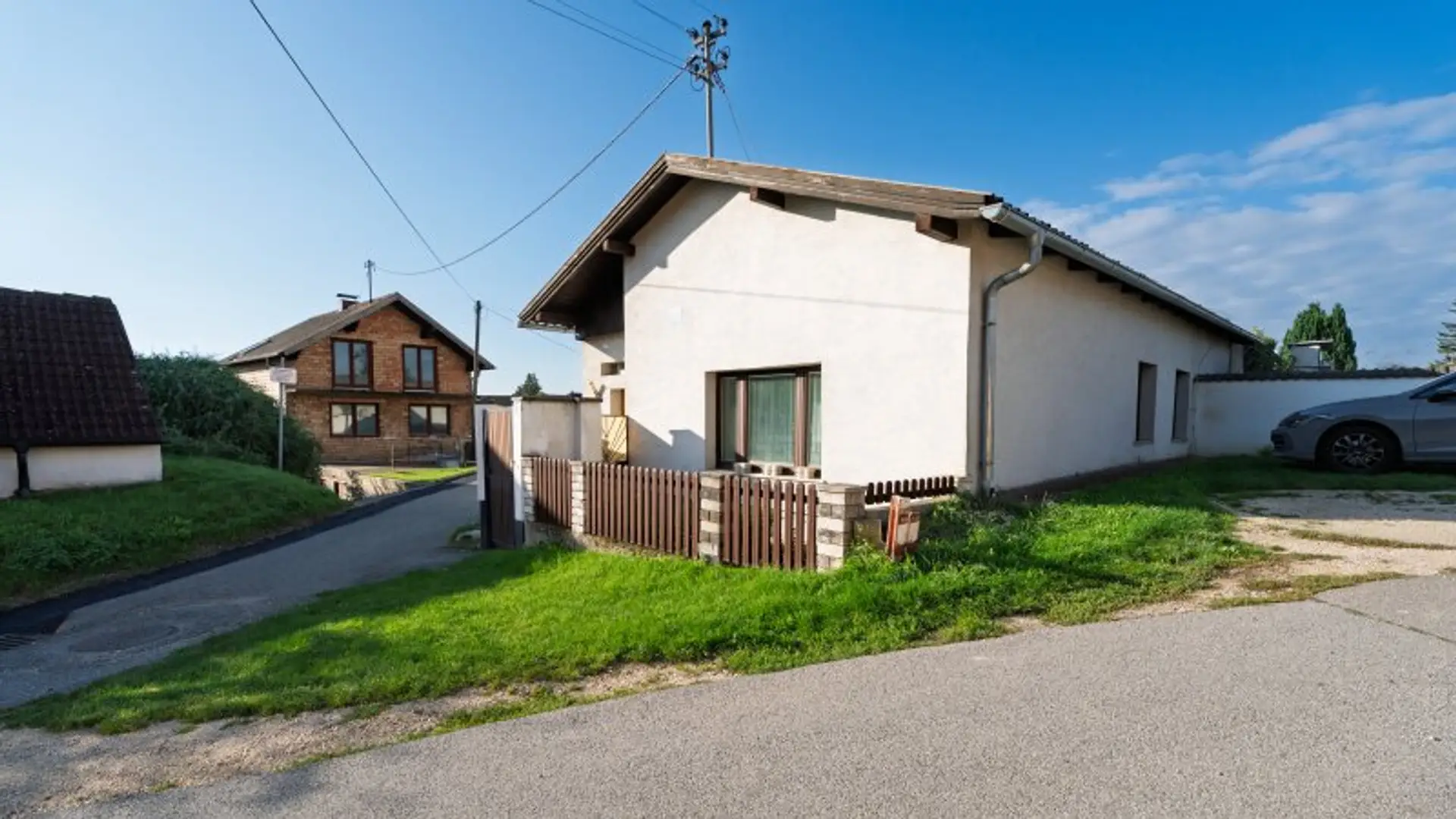 Das Haus ist sowohl vom vorderen Hof als auch von der Straßenseite aus begehbar. Ein großzügiger Eingangsbereich mit separatem WC führt in den zentralen Vorraum. Von hier gelangt man in einen Abstellraum, das Wohnzimmer sowie die Küche. Das Badezimmer ist direkt von der Küche aus erreichbar. Ein weiterer Gang führt in das große Schlafzimmer.