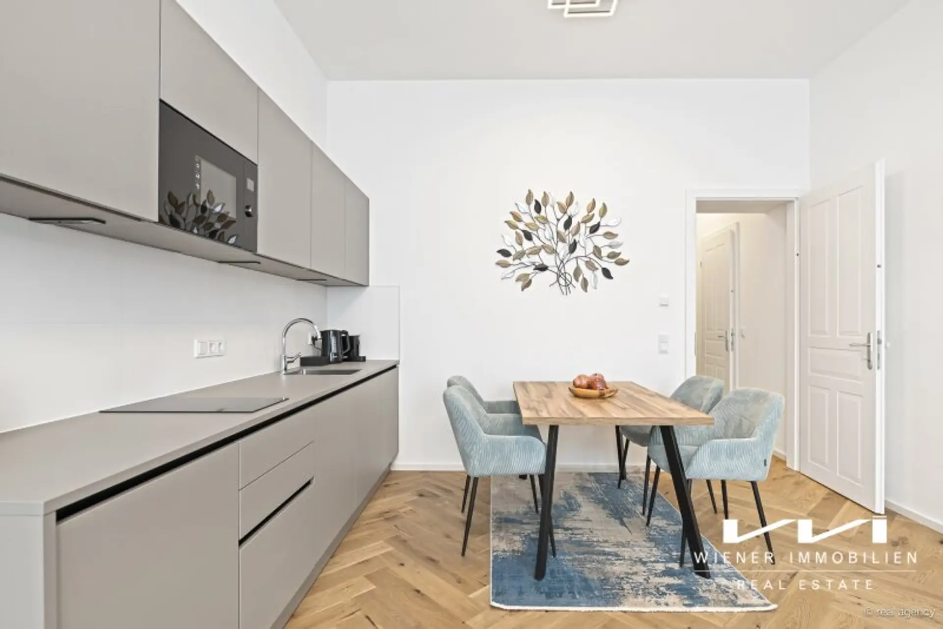 Warme Parkettböden, klare Linien und eine zeitgemäße Formensprache schaffen ein Wohngefühl, das Geborgenheit und Stil vereint. Die hochwertige Einbauküche fügt sich selbstverständlich in das Wohnkonzept ein und lädt zum Genießen ein. Das elegant gestaltete Badezimmer mit Dusche rundet das stimmige Gesamtbild ab und wird zu einem Ort des Rückzugs und Wohlbefindens.