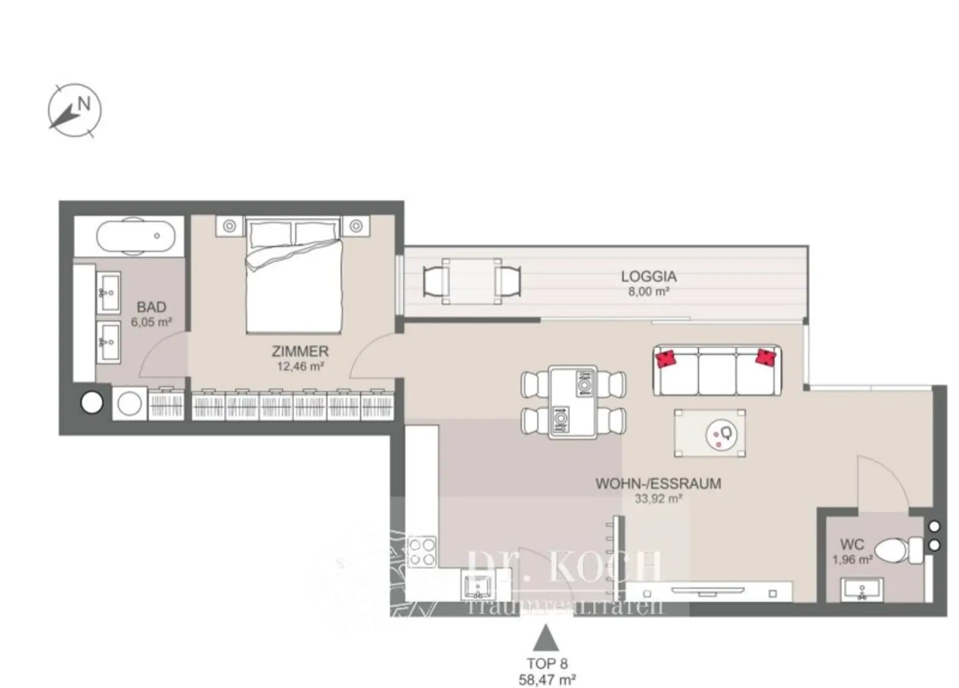 sowie ein vom Wohnsalon separat zugängliches WC.