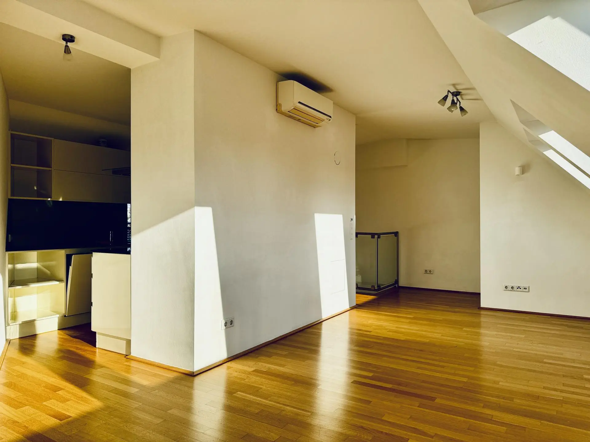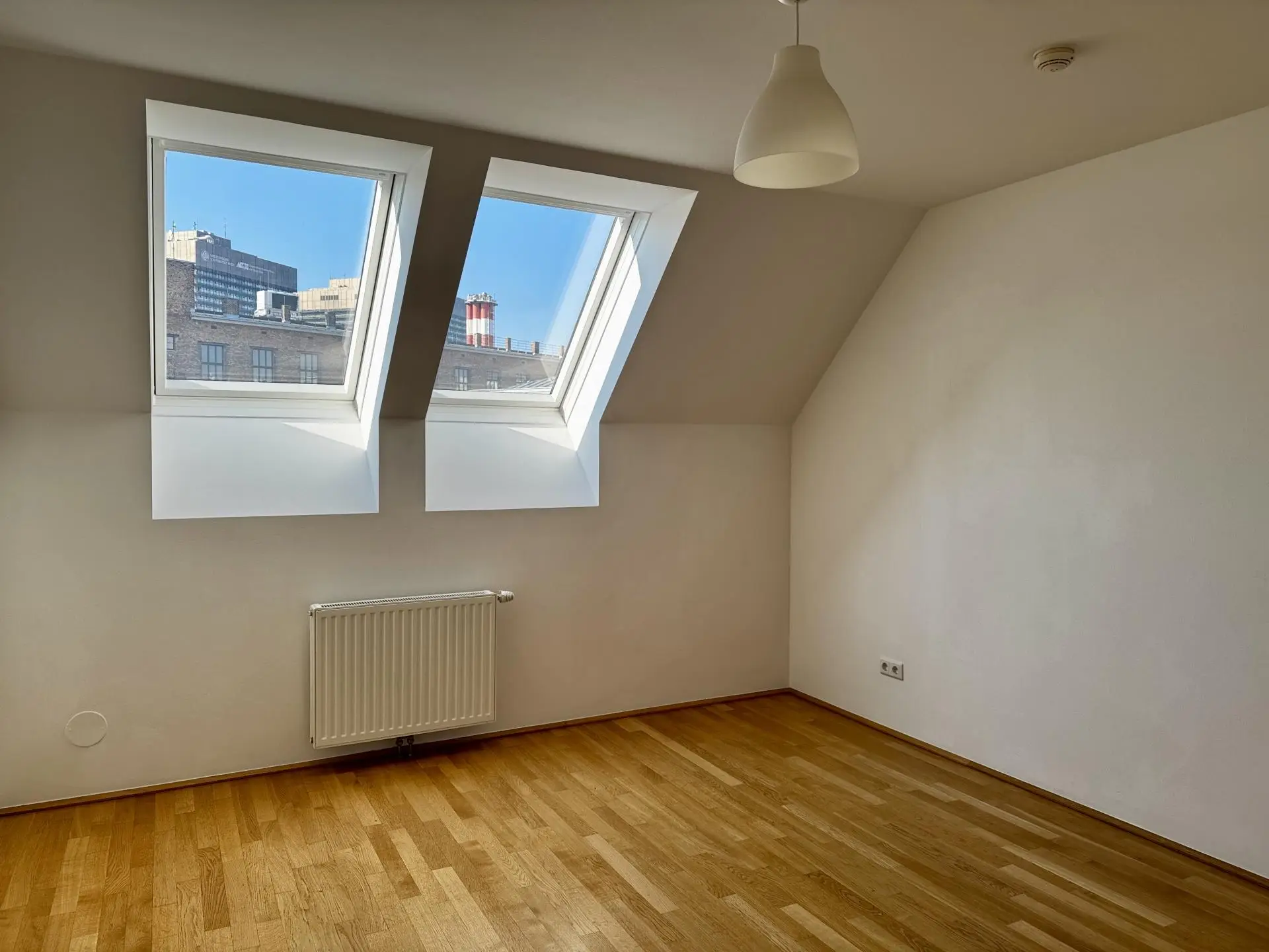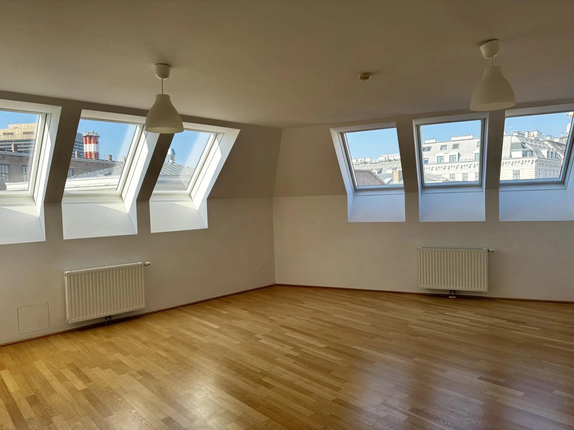 Diese lichtdurchflutete Wohnung liegt im Dachgeschoß eines schönen Wiener Altbaus. Mit dem Lift erreicht man bequem die Wohnung, die auf zwei Ebenen aufgeteilt ist.