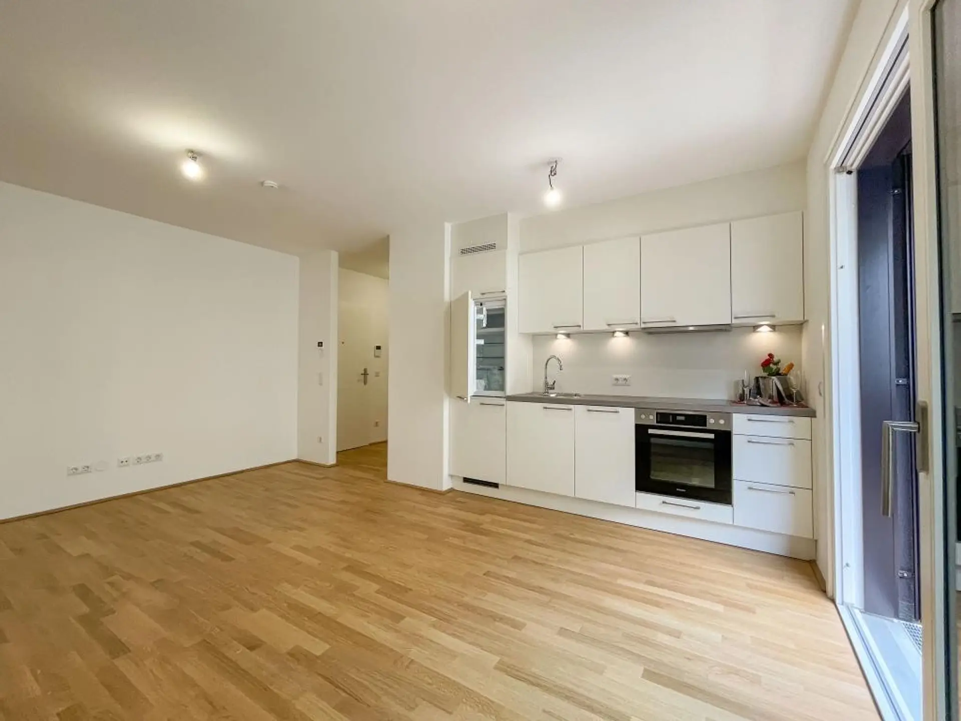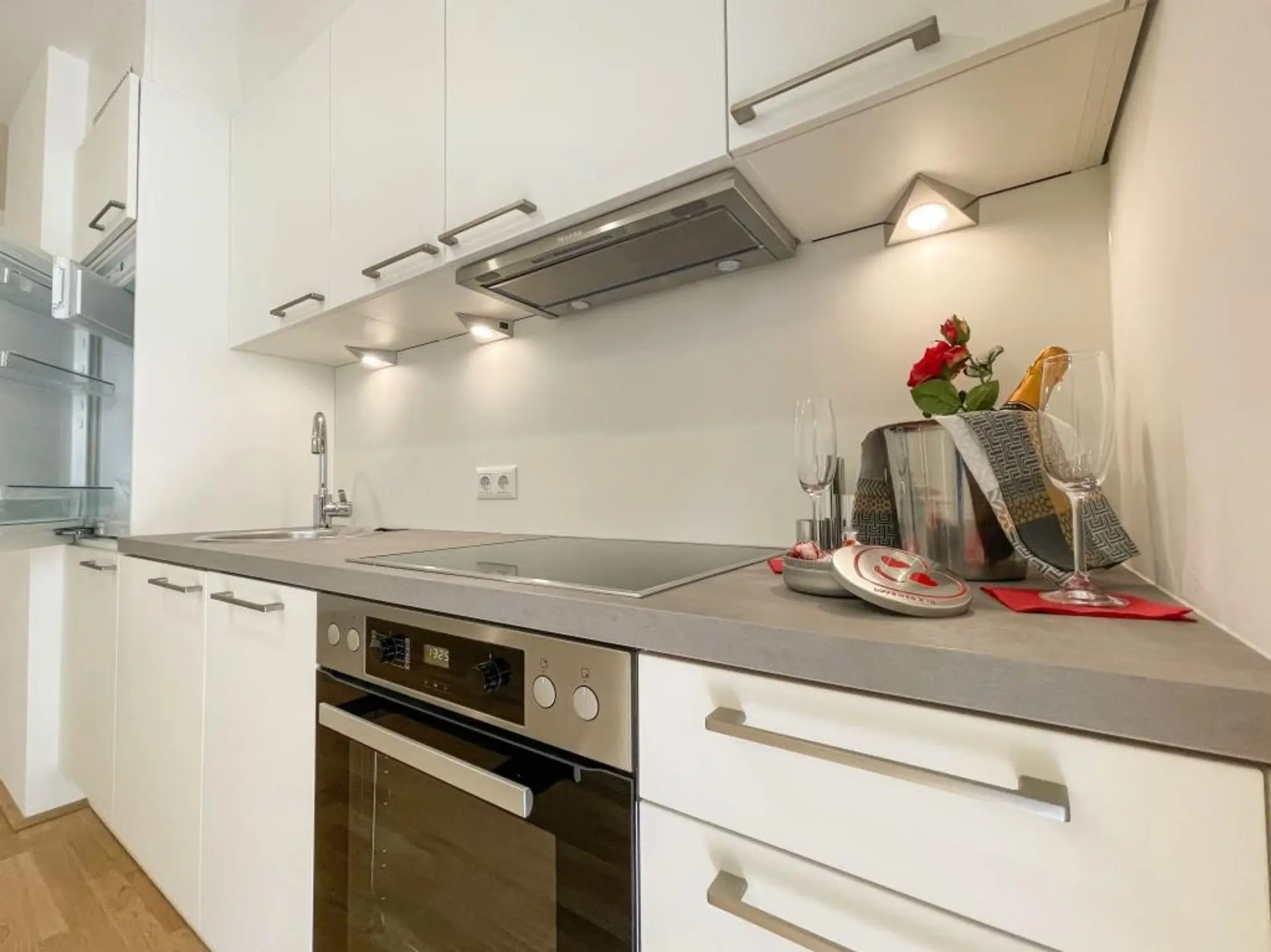 ist gut 20 m² groß und verbindet sich fließend mit dem 4,43m² Vorraum. Über eine Front von knapp 3 m steht eine nagelneue Küche mit Ober- und Unterschränke und LED Beleuchtung der Arbeitsfläche, 4-flammiges Ceranfeld und Backofen, Dunstabzug mit Beleuchtung des Kochfeldes, Geschirrspüler sowie ein Kühlschrank mit Gefrierfach. Alle Geräte sind von Miele. Ein sonniger 3m² Balkon schließt an das Wohnzimmer straßenseitig an.Pflanzkisten sind bereits in das Geländer integriert und ein Wasseranschluß ist ebenfalls vorhanden.