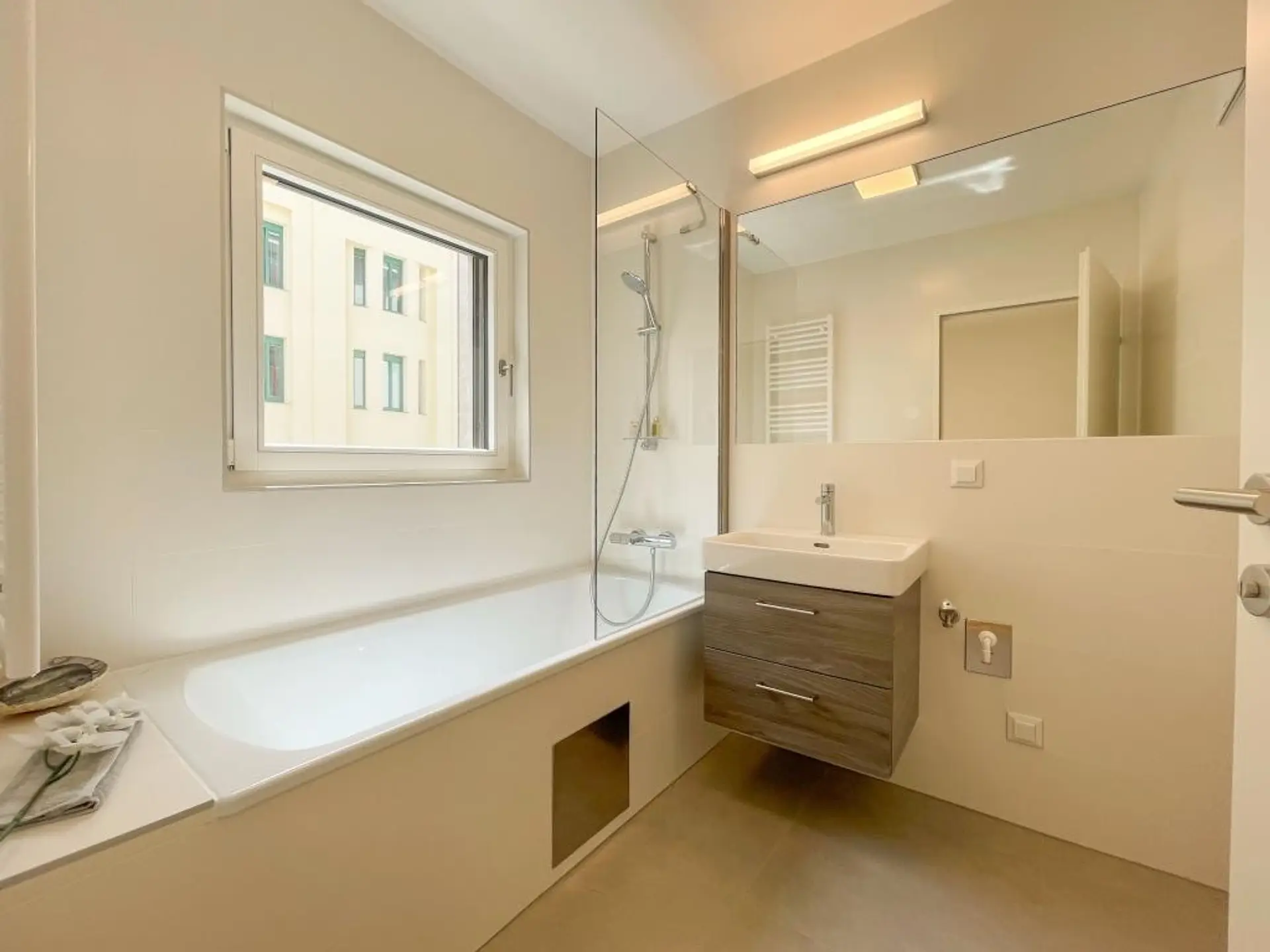 ist 11m² groß und verfügt gleich nach dem Eingang über einen 3m² durch eine Trennwand abgesonderten Ankleidebereich, sowie über ein en Suite Bad mit Badewanne, Duschtrennwand, Waschbecken mit Unterbauschrank, Handtuchtrockner und WM-Anschluss. Vor dem Fenster findet man ebenfalls fixierte Pflanzkisten vor.