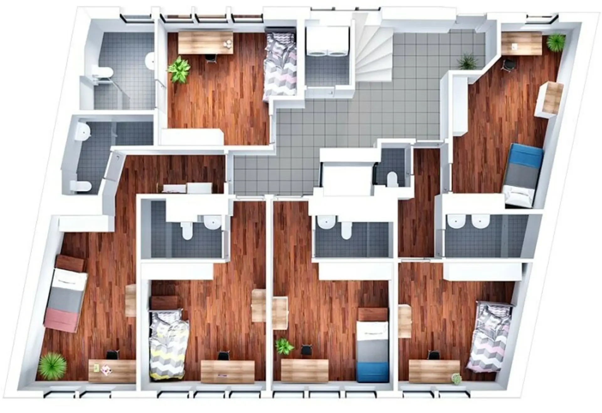 Privatbereiche zwischen 18 m² und 25 m² plus 77 m² Gemeinschaftsflächen: eine voll ausgestattete Küche, ein Essbereich, ein Wohnbereich, ein Wirtschaftsraum sowie zwei Dachterrassen mit insgesamt 37 m².