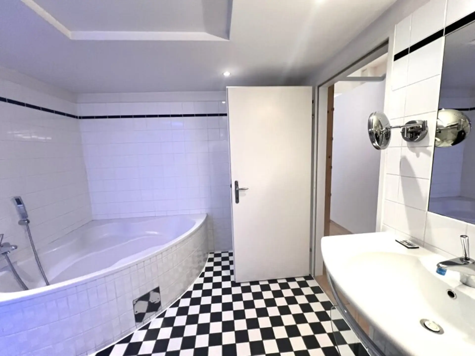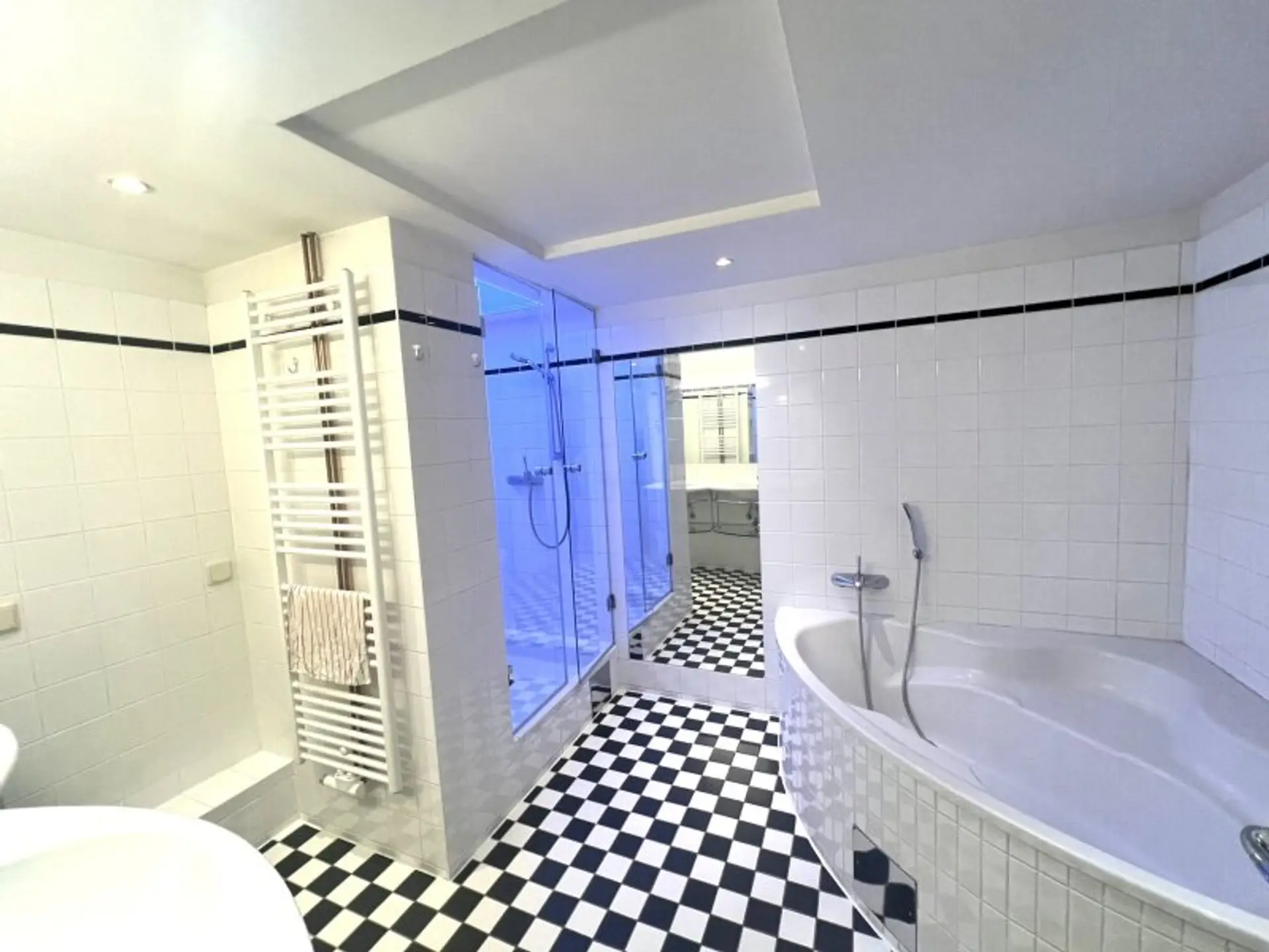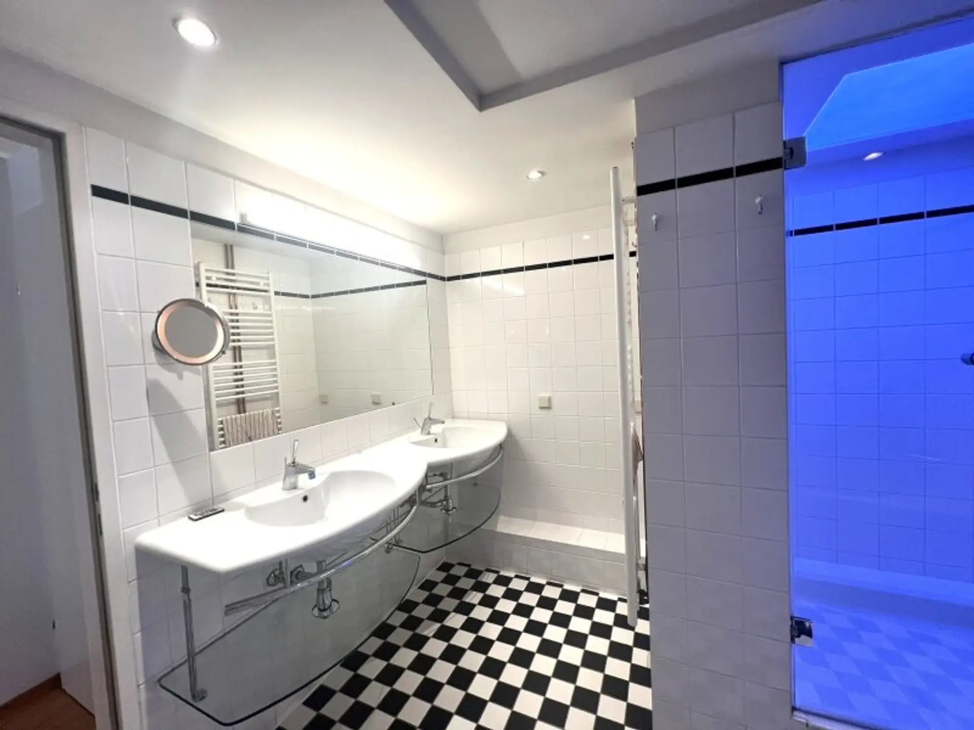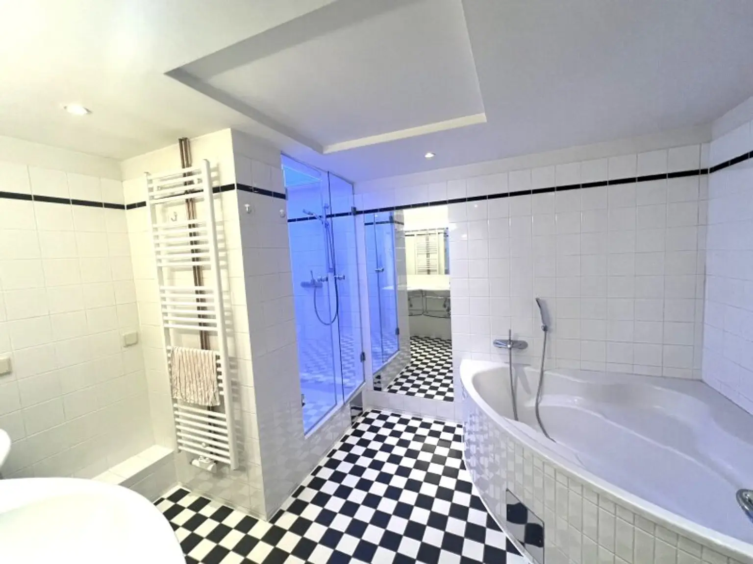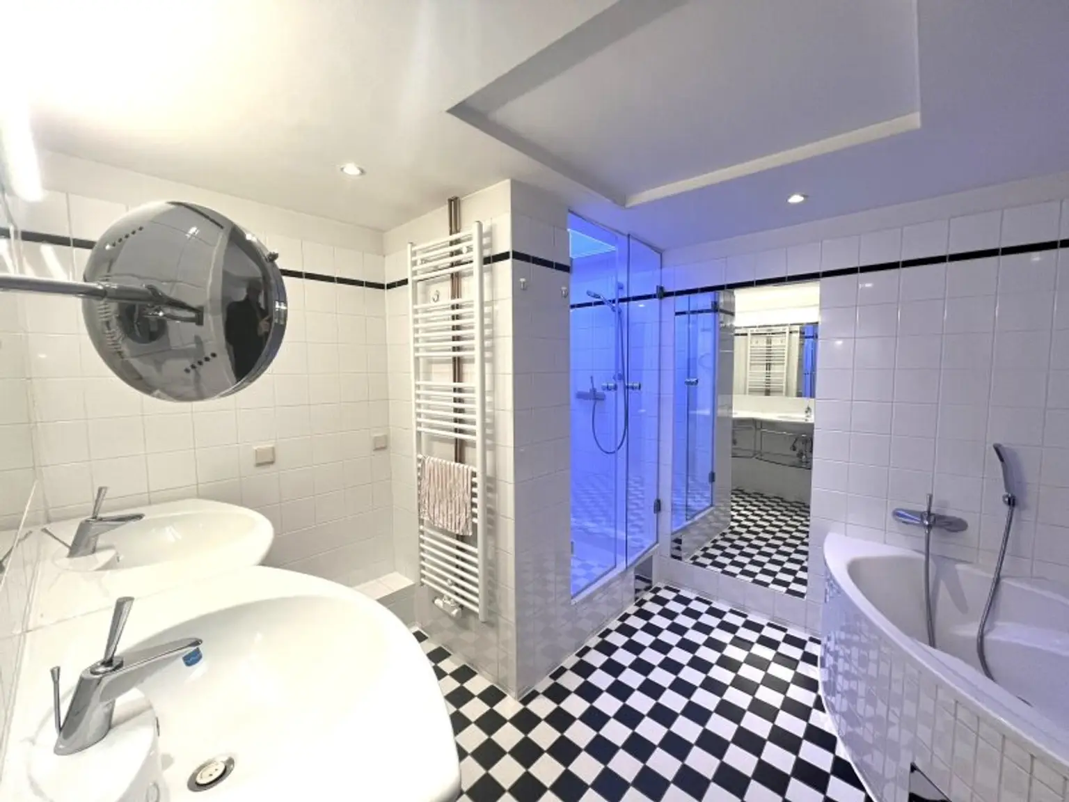 * Badezimmer mit Doppelwaschtisch, Badewanne, Dusche und Waschmaschinenanschluss