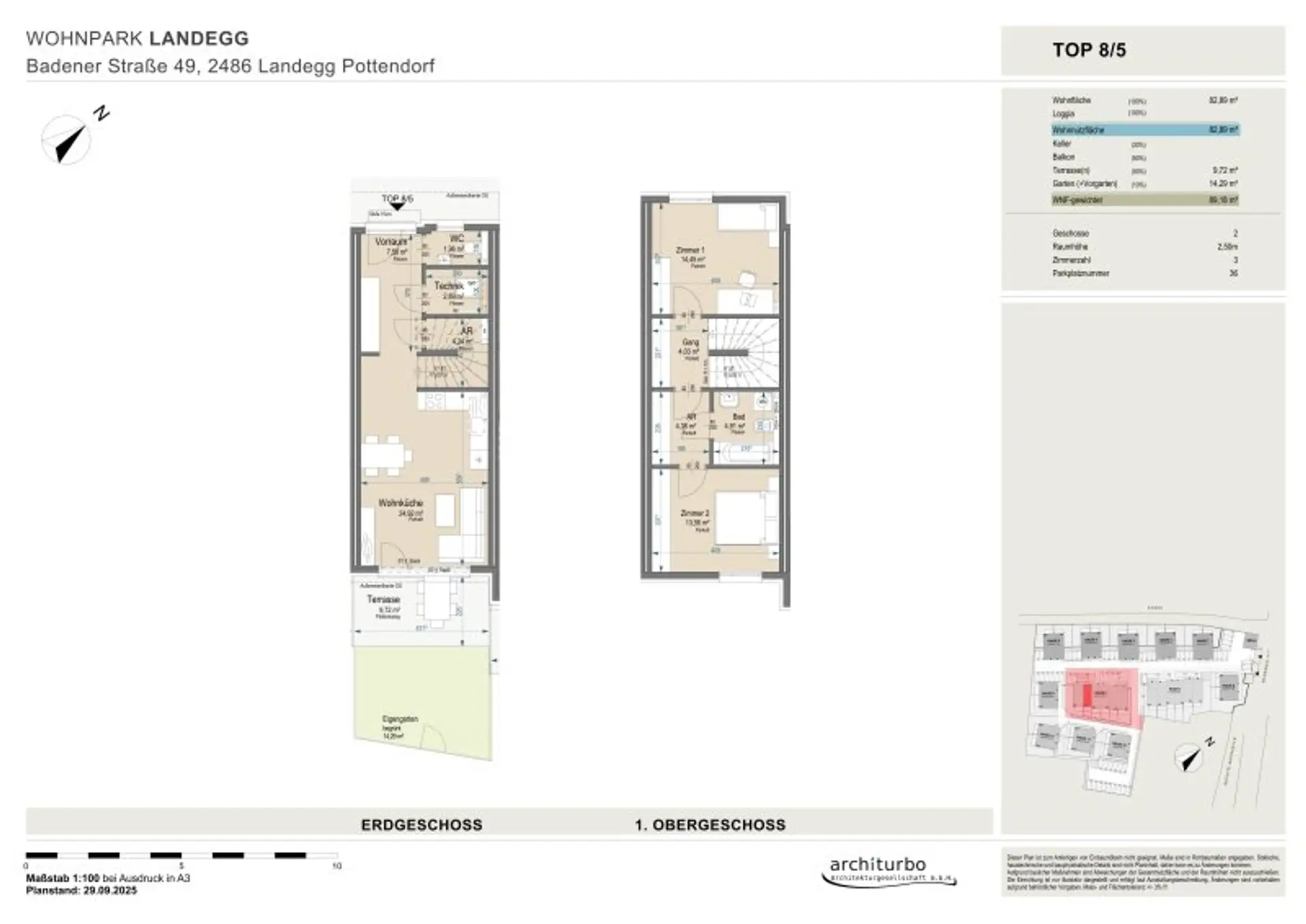 Mittig gelegenes ost-/westseitig ausgerichtetes 2-geschoßiges Reihenhaus mit 83 m2 Wohnnutzfläche, 10 m2 Terrassenfläche und 14 m2 Gartenfläche.