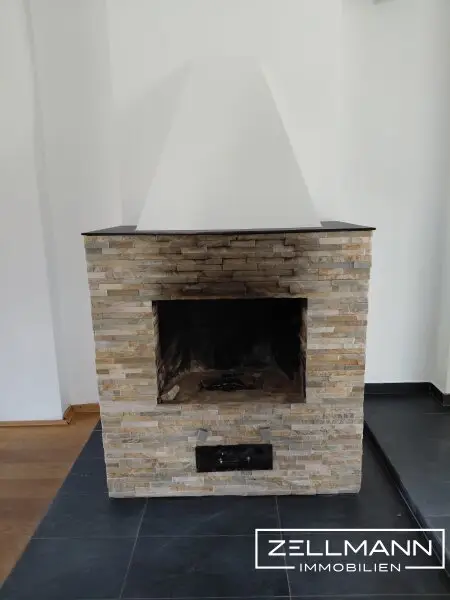 Der einladende Vorraum mit Gäste-WC und praktischem Abstellraum führt direkt in den beeindruckenden Wohnbereich. Die offen gestaltete Wohnküche mit Essplatz geht fließend in das Wohnzimmer über. Der offene Kamin und die sichtbaren Holzbalken bilden das Herzstück des Raumes – hier entsteht sofort ein Gefühl von Weite, Wärme und Zuhause.