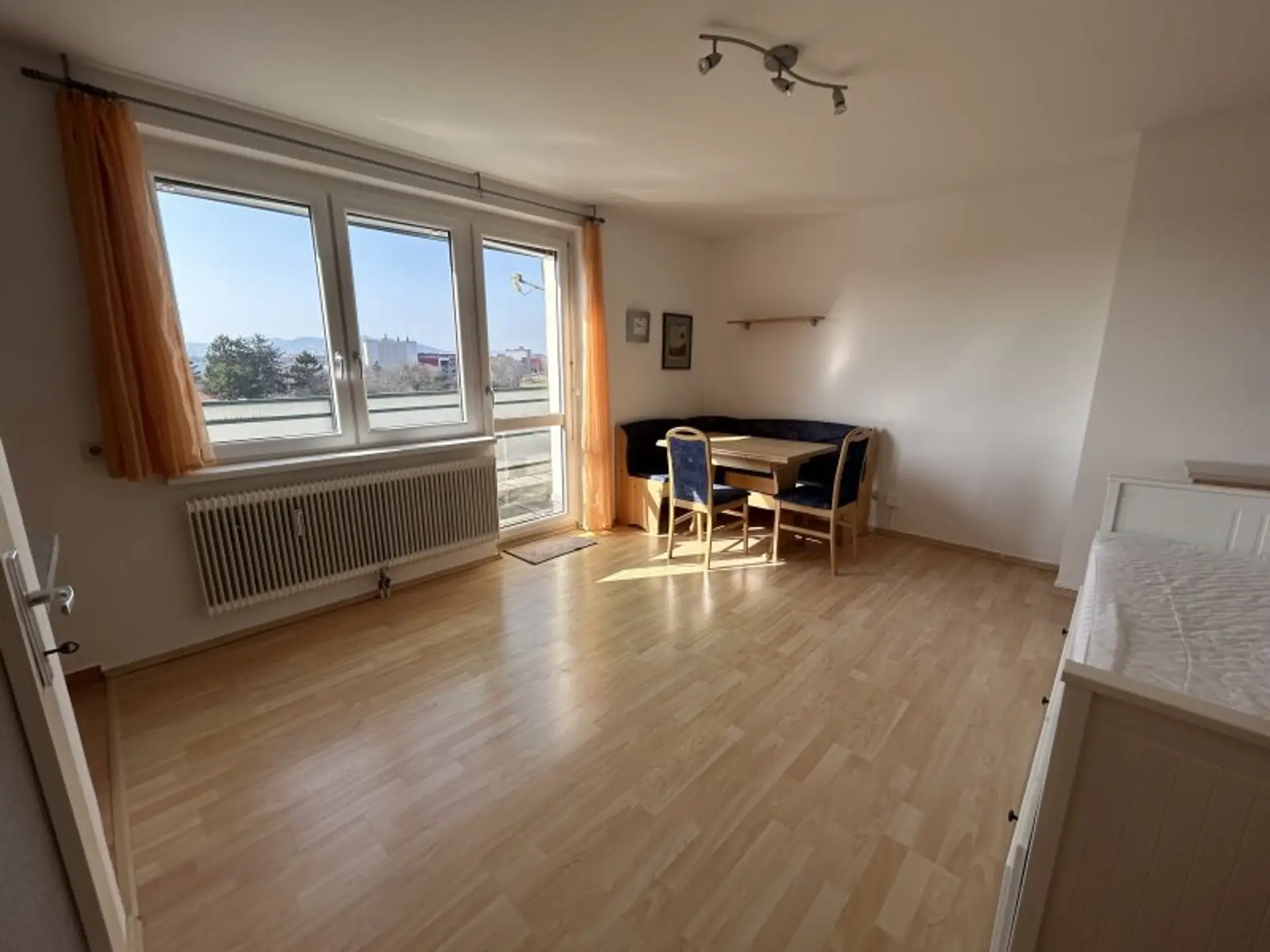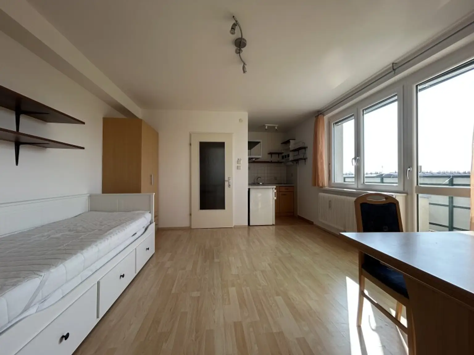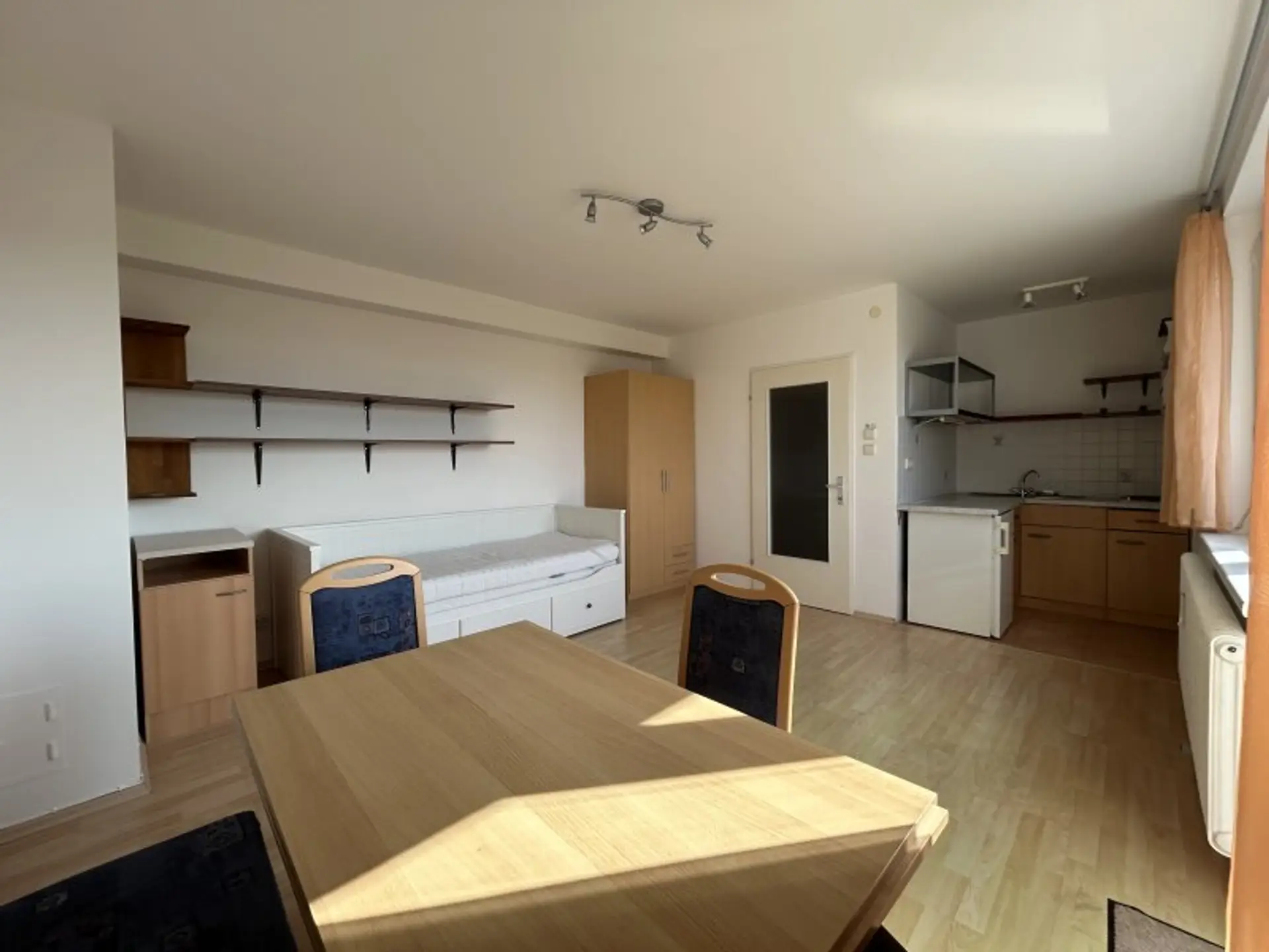 SEHR gut eingeteilte GARCONNIERE / gemäß Plan 31,12m² Wohnfläche + ca. 9,62m² TERRASSE / zentraler Vorraum + geräumiges Wohn-/Schlafzimmer samt ausgestatteter Kochnische + großes BADEZIMMER (6,15m²) mit Fenster, Dusche, Waschtisch, Waschmaschinenanschluss und WC + Abstellraum.
