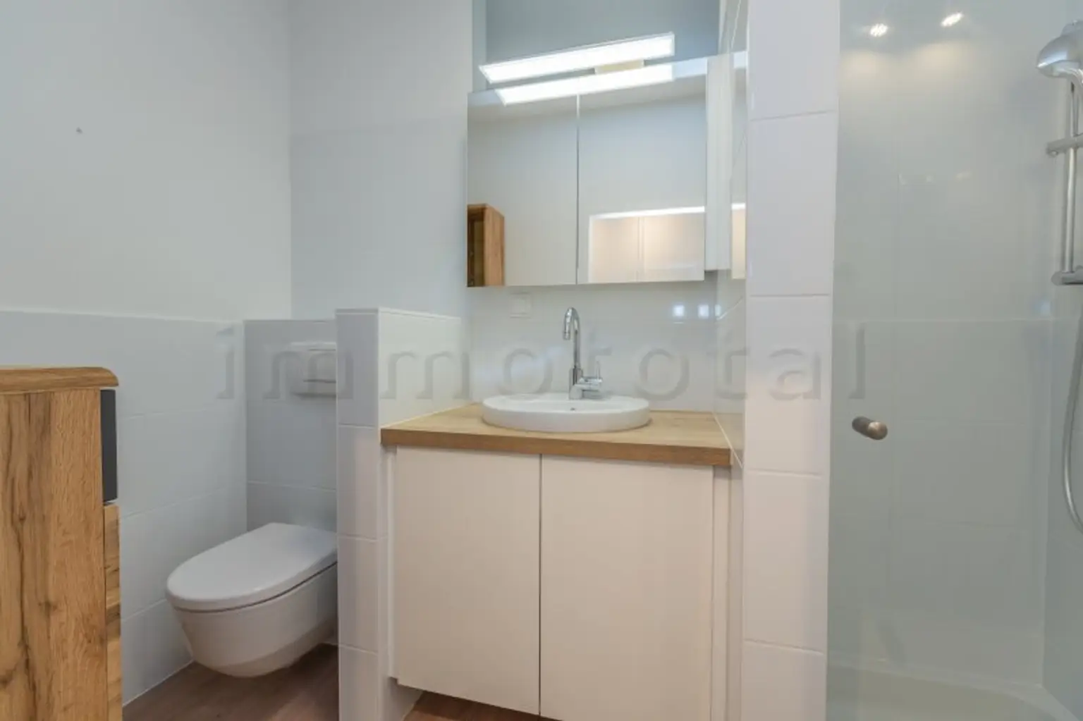 Komplett erneuertes Badezimmer mit neuen Fliesen, Armaturen, Waschbecken, Spiegelschrank, Glasdusche und Badmöbeln