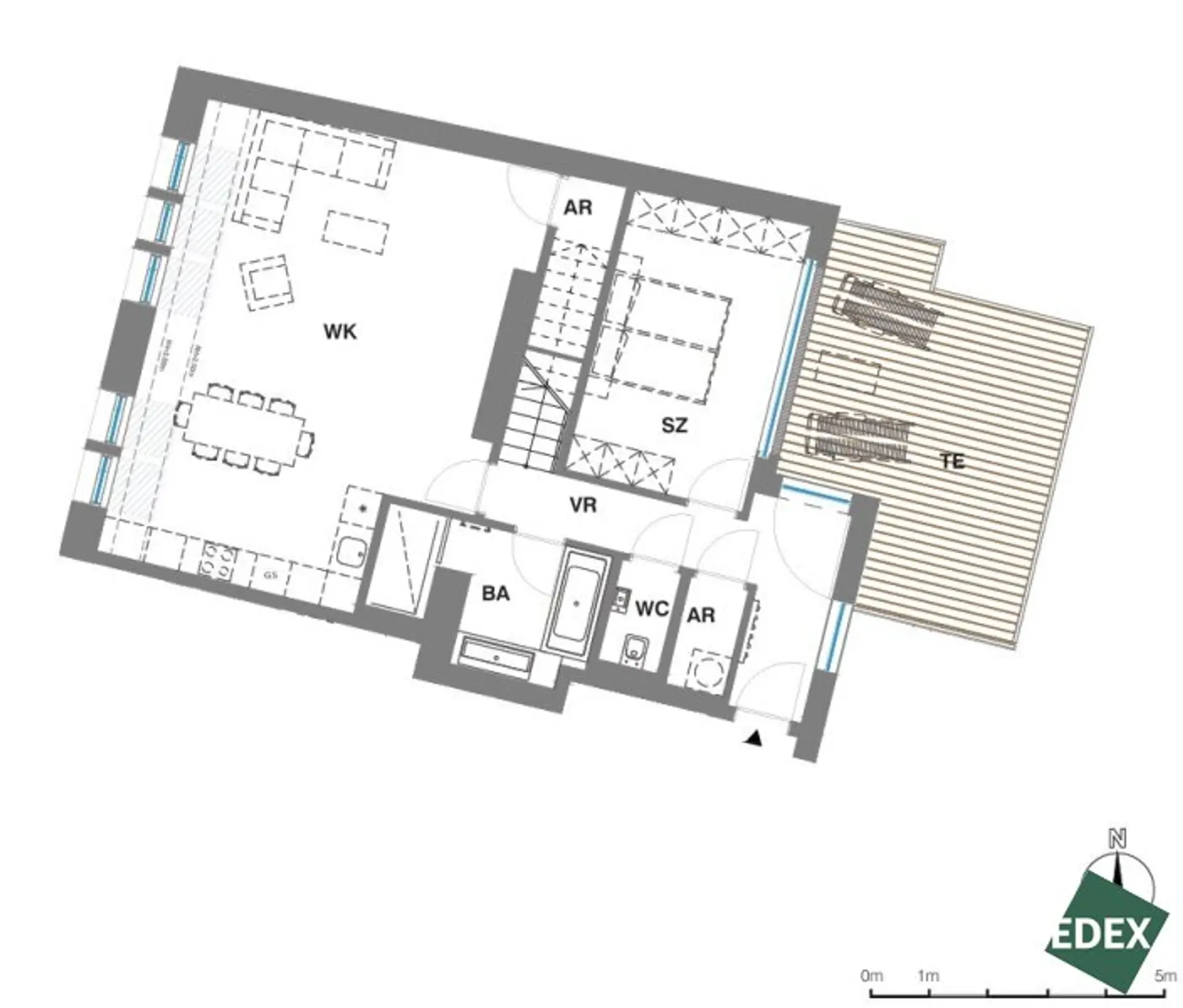 Diese Dachgeschosswohnung besitzt einen idealen Grundriss, erstreckt sich über zwei Ebenen und teilt sich wie folgt auf:
