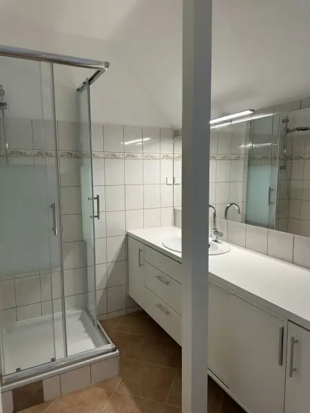 * Großes Badezimmer mit Dusche, Doppelwaschtisch, Waschmaschine, französisches Fenster und WC