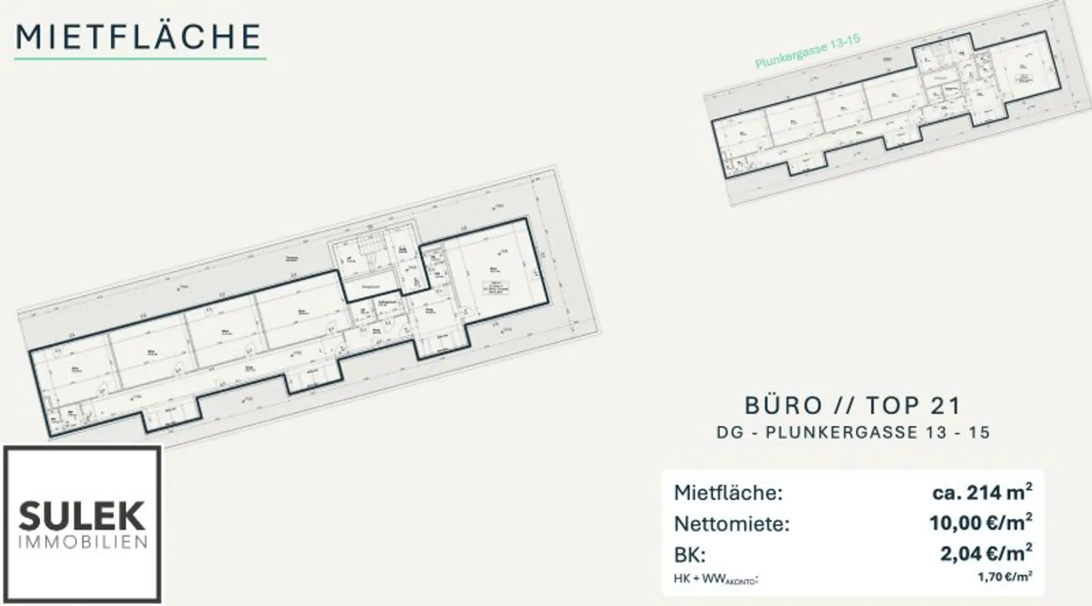 Die Liegenschaft umfasst zwei Gebäudeteile: das repräsentative Gründerzeithaus „Fröhlich Hof“ an der Hütteldorfer Straße sowie einen modernen Neubau in der ruhigeren Plunkergasse – ein attraktiver Standort für vielseitige gewerbliche Nutzungen.