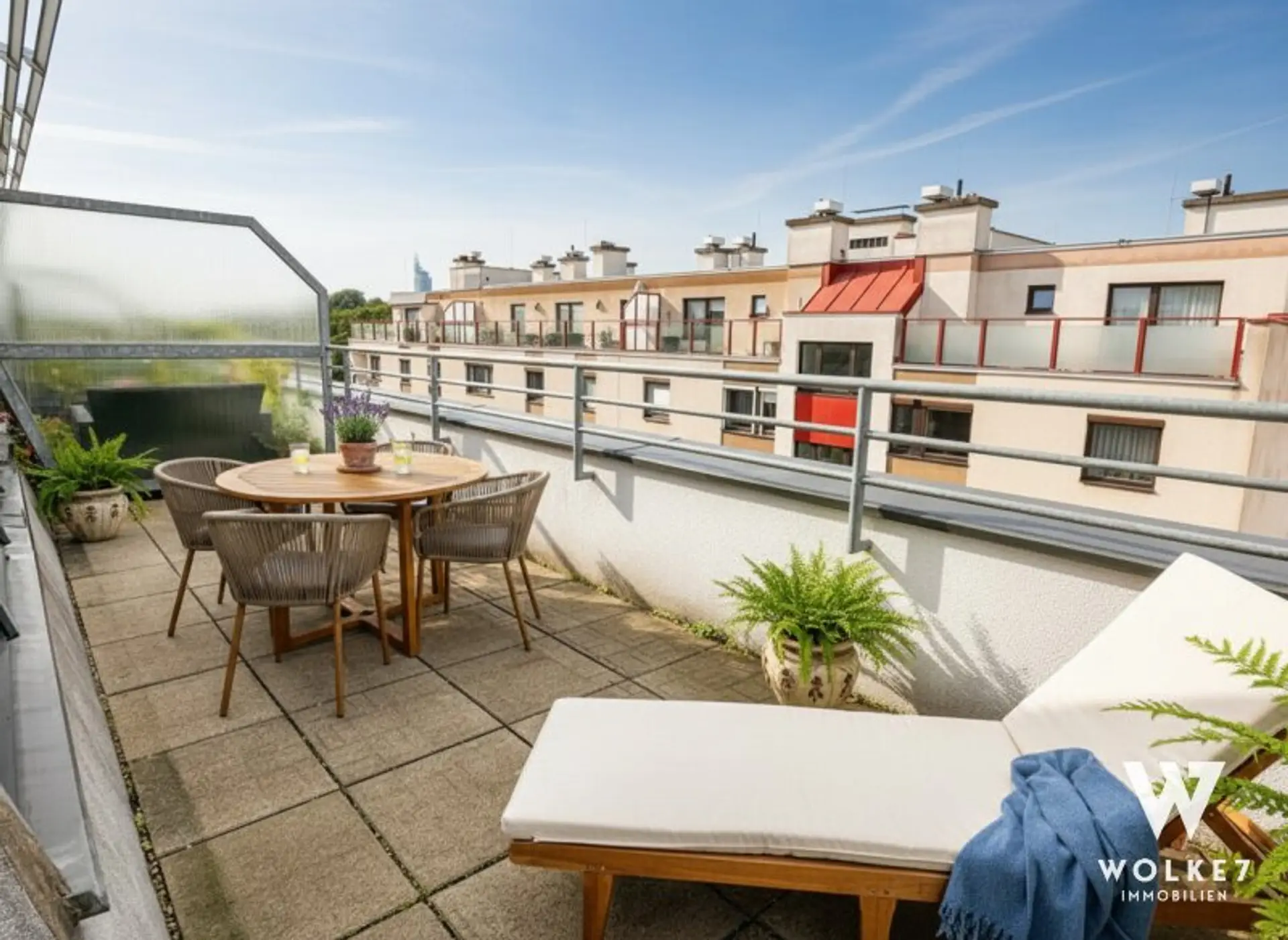 Zwei sonnige Terrassen (insgesamt ca. 17,4 m²) mit Blick zur Alten Donau & Donauturm