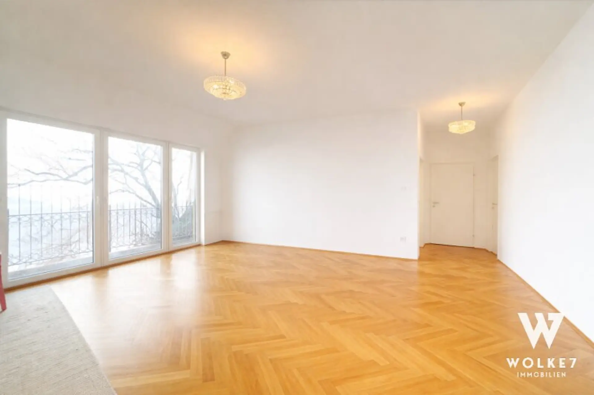 Sechs große Fenster mit französischen Balkonen durchfluten den Wohnbereich mit Tageslicht. Durch die nordseitige Ausrichtung bleibt das Raumklima auch in den Sommermonaten angenehm.