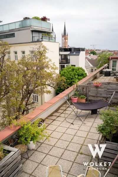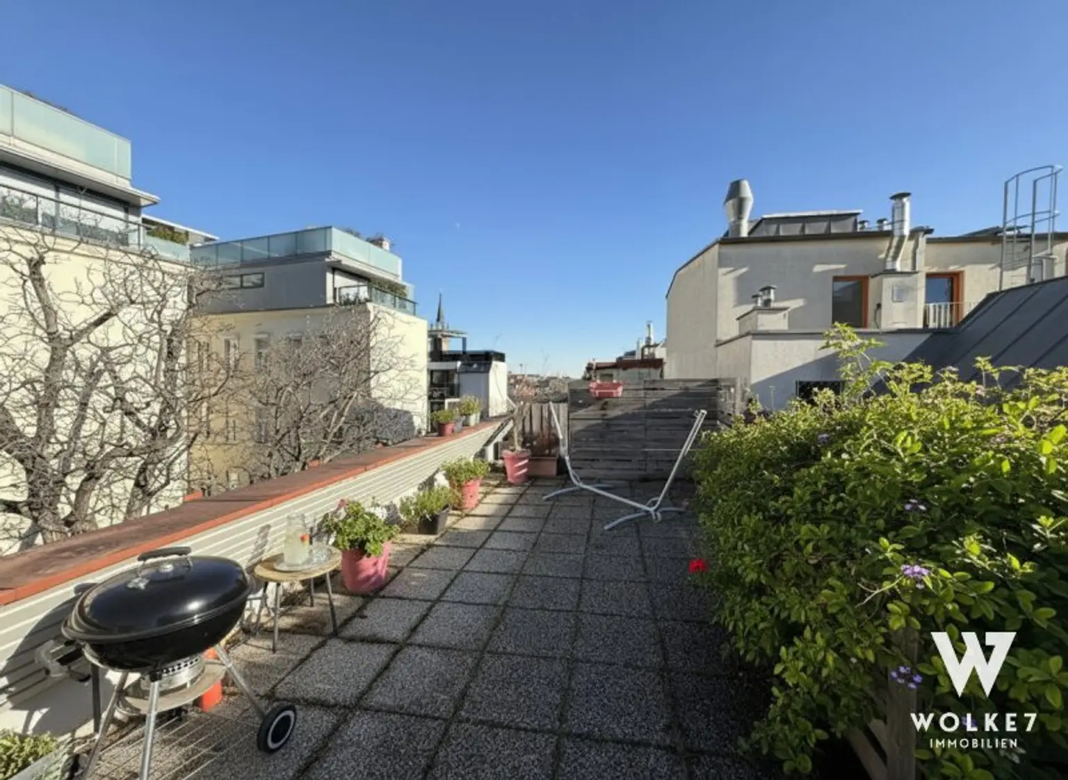 Ein absolutes Highlight ist die direkt über der Wohnung liegende Dachterrasse – ein privater Rückzugsort über den Dächern Wiens. Von hier aus genießen Sie Sonne, Ruhe und sogar einen Blick auf den Stephansdom – eine seltene Kombination aus Urbanität und Privatsphäre.