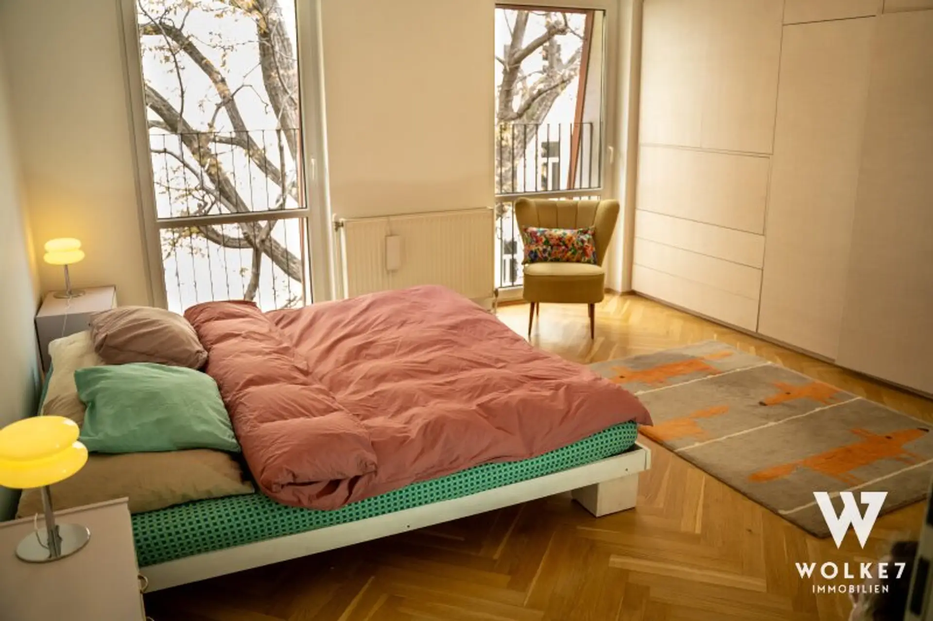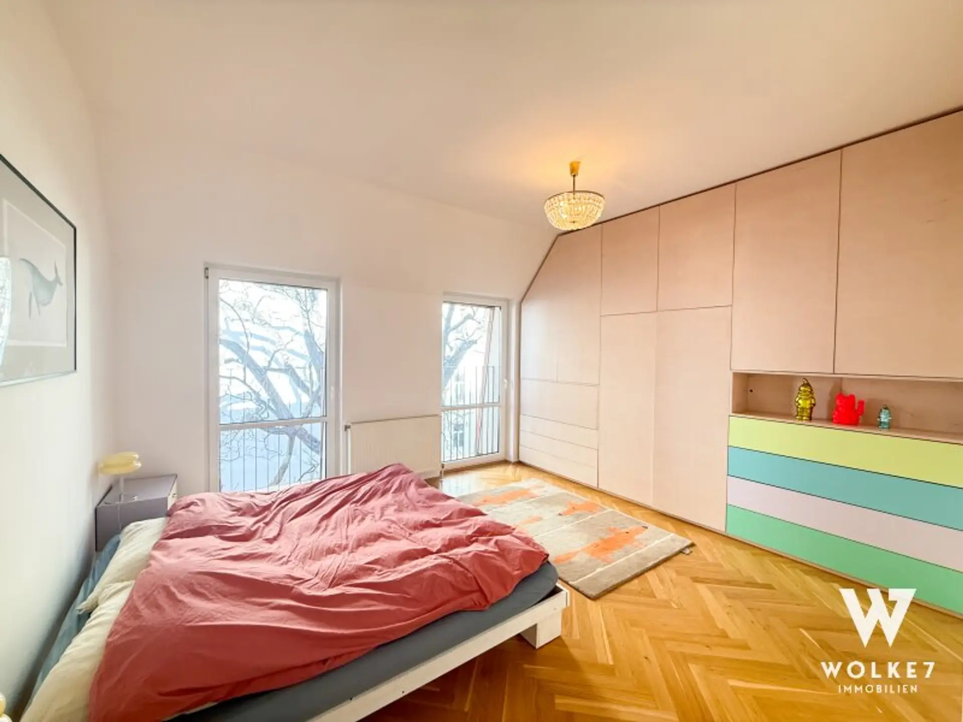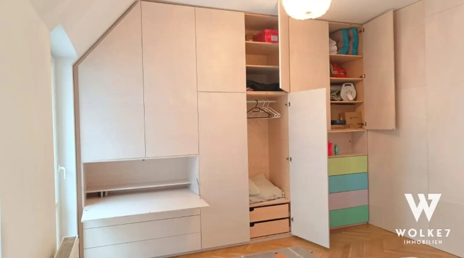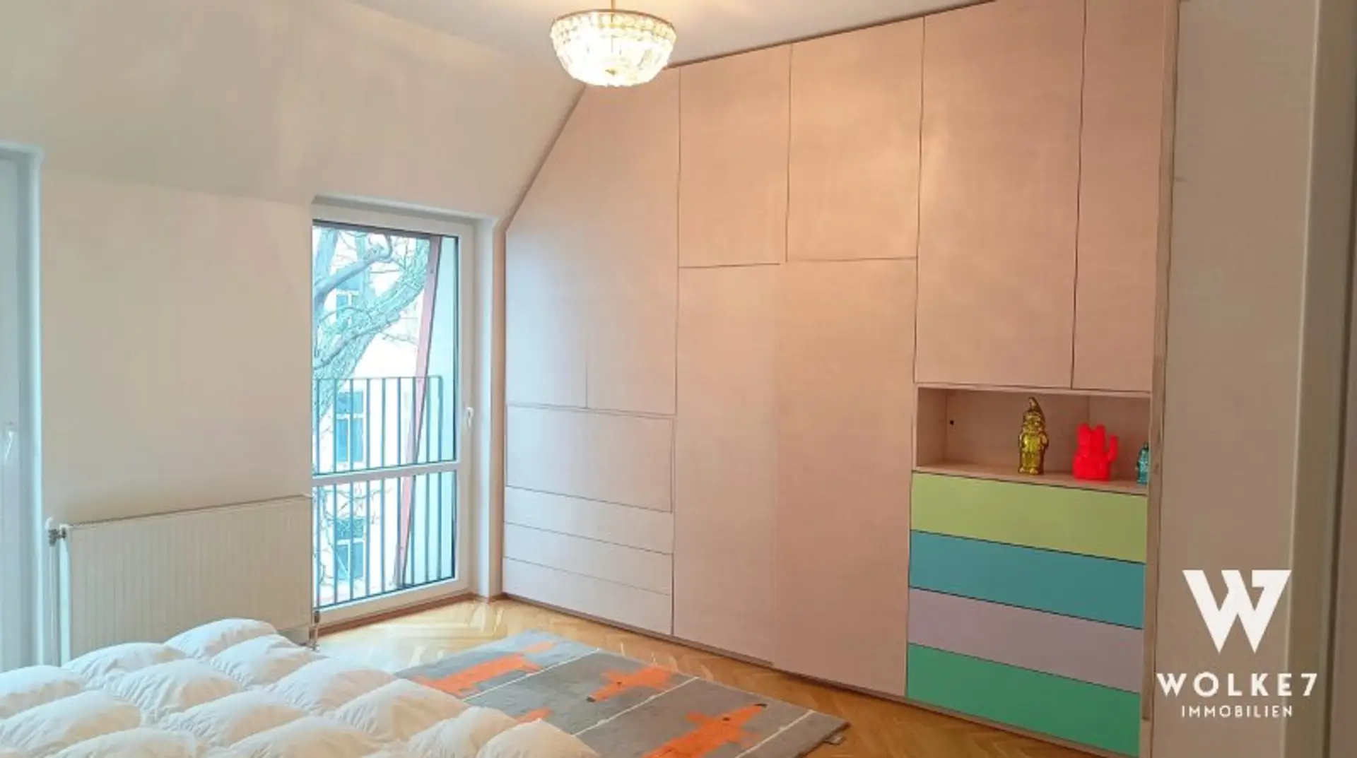 Im Schlafzimmer wurde vom Tischler ein hochwertiger Echtholz-Einbauschrank maßgefertigt integriert. Dieser bietet großzügigen Stauraum und verfügt über einen clever versteckten Sekretär – funktional und ästhetisch zugleich.