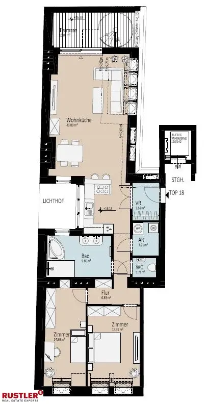 Objektbeschreibung: In begehrter Lage des 2. Wiener Gemeindebezirks, nur wenige Schritte vom grünen Prater und dem Donaukanal entfernt, entsteht ein stilvolles Dachgeschossprojekt in einem charmanten Gründerzeithaus am Czerninplatz 5. Das Projekt umfasst drei exklusive Dachgeschosswohnungen mit Wohnflächen von ca. 99 m² bis 151 m², großzügigen Freiflächen in Form von Terrassen sowie einer hochwertigen Ausstattung, die modernes Wohngefühl mit urbanem Flair vereint. Das elegante Altbauhaus wird im Zuge des Dachgeschossausbaus umfassend revitalisiert, wobei historischer Charme und zeitgemäßer Wohnkomfort harmonisch miteinander verschmelzen. Die neu errichteten Wohneinheiten bieten lichtdurchflutete Grundrisse, eine intelligente Raumaufteilung und hochwertige Ausstattungsdetails – ideal für anspruchsvolle Eigennutzer:innen oder als wertbeständige Investmentmöglichkeit. Wohnungen im Überblick: Die Wohneinheit zeichnet sich durch klare Linien, eine offene Raumgestaltung und eine helle Atmosphäre aus. Großzügige Fensterflächen sowie durchdachte Architekturkonzepte schaffen ein besonders luftiges Wohngefühl. • Top 18 – ca. 99 m² Wohnfläche + Terrasse 3 Zimmer, großzügiger Wohn-Essbereich, Badezimmer mit Tageslicht, Terrasse mit Innenhofblick Ausstattungsmerkmale: • Hochwertiger Parkettboden (z. B. Eiche Landhausdiele) • Fußbodenheizung • Große Fensterfronten mit 3-fach Verglasung • Hochwertige Sanitärausstattung namhafter Hersteller • Großformatige Feinsteinzeug-Fliesen in Bad und WC • Sicherheitstür • Personenlift bis in das Dachgeschoss Lage & Infrastruktur: Der Czerninplatz zählt zu den gefragtesten Adressen im 2. Bezirk, Leopoldstadt. Die unmittelbare Nähe zum Donaukanal und zum Wiener Prater, sowie die hervorragende Verkehrsanbindung (U2 Taborstraße, U1 Nestroyplatz, Straßenbahnlinie 2, Buslinien) bieten ein ideales Gleichgewicht zwischen urbanem Leben und naturnahem Wohnen. Die Umgebung bietet eine hervorragende Infrastruktur mit zahlreichen Einkaufsmöglichkeiten, charmanten Cafés, Restaurants, Schulen, Kindergärten und medizinischen Einrichtungen. Die Wiener Innenstadt ist in wenigen Minuten erreichbar, ebenso wie der Donaukanal und das trendige Karmeliterviertel.