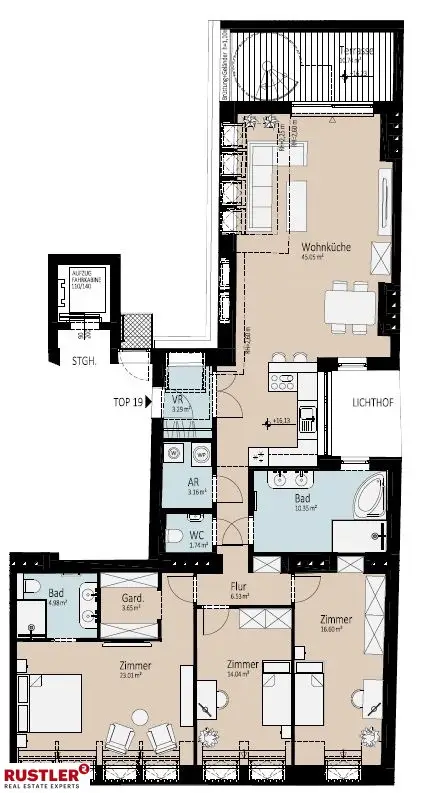 Objektbeschreibung: In begehrter Lage des 2. Wiener Gemeindebezirks, nur wenige Schritte vom grünen Prater und dem Donaukanal entfernt, entsteht ein stilvolles Dachgeschossprojekt in einem charmanten Gründerzeithaus am Czerninplatz 5. Das Projekt umfasst drei exklusive Dachgeschosswohnungen mit Wohnflächen von ca. 99 m² bis 151 m², großzügigen Freiflächen in Form von Terrassen sowie einer hochwertigen Ausstattung, die modernes Wohngefühl mit urbanem Flair vereint. Das elegante Altbauhaus wird im Zuge des Dachgeschossausbaus umfassend revitalisiert, wobei historischer Charme und zeitgemäßer Wohnkomfort harmonisch miteinander verschmelzen. Die neu errichteten Wohneinheiten bieten lichtdurchflutete Grundrisse, eine intelligente Raumaufteilung und hochwertige Ausstattungsdetails – ideal für anspruchsvolle Eigennutzer:innen oder als wertbeständige Investmentmöglichkeit. Wohnungen im Überblick: Die Wohneinheit zeichnet sich durch klare Linien, eine offene Raumgestaltung und eine helle Atmosphäre aus. Großzügige Fensterflächen sowie durchdachte Architekturkonzepte schaffen ein besonders luftiges Wohngefühl. • Top 19 – ca. 132 m² Wohnfläche + Terrasse 4 Zimmer, Master-Bedroom mit en suite Bad, offener Wohnbereich, Südterrasse mit Weitblick Ausstattungsmerkmale: • Hochwertiger Parkettboden (z. B. Eiche Landhausdiele) • Fußbodenheizung • Große Fensterfronten mit 3-fach Verglasung • Hochwertige Sanitärausstattung namhafter Hersteller • Großformatige Feinsteinzeug-Fliesen in Bad und WC • Sicherheitstür • Personenlift bis in das Dachgeschoss Lage & Infrastruktur: Der Czerninplatz zählt zu den gefragtesten Adressen im 2. Bezirk, Leopoldstadt. Die unmittelbare Nähe zum Donaukanal und zum Wiener Prater, sowie die hervorragende Verkehrsanbindung (U2 Taborstraße, U1 Nestroyplatz, Straßenbahnlinie 2, Buslinien) bieten ein ideales Gleichgewicht zwischen urbanem Leben und naturnahem Wohnen. Die Umgebung bietet eine hervorragende Infrastruktur mit zahlreichen Einkaufsmöglichkeiten, charmanten Cafés, Restaurants, Schulen, Kindergärten und medizinischen Einrichtungen. Die Wiener Innenstadt ist in wenigen Minuten erreichbar, ebenso wie der Donaukanal und das trendige Karmeliterviertel.