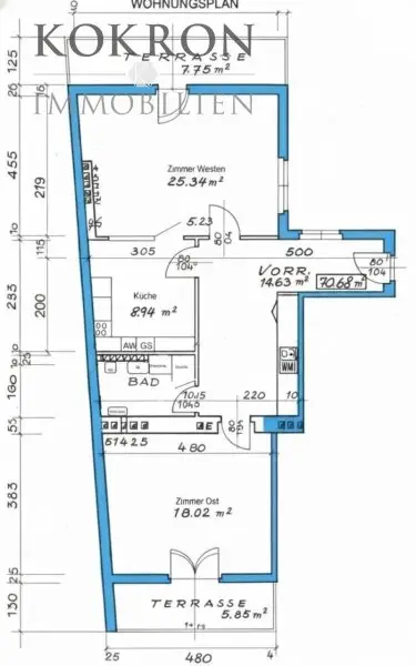 Der Vorraum bietet Zugang zur voll ausgestatteten schönen Küche (ca. 9m²), dem westlichen Zimmer (ca. 25,3m²) mit West-Terrasse (ca.7,8m²) , dem östlichen Zimmer (ca. 18m²) mit Ost-Terrasse (ca.5,9m²) und dem Badezimmer (ca. 3,8m²) mit barrierefreier Duschkabine, Waschmaschine und WC.