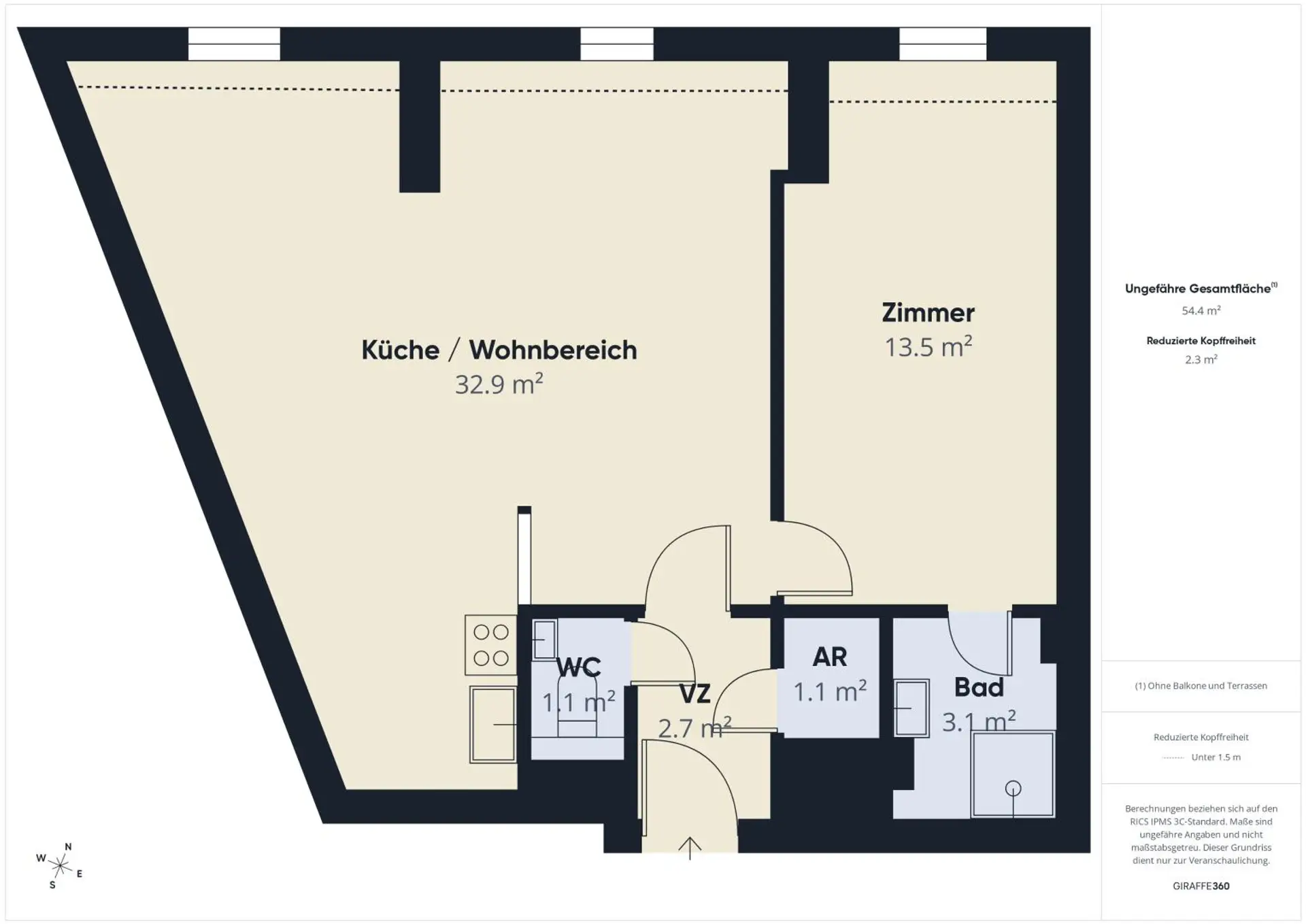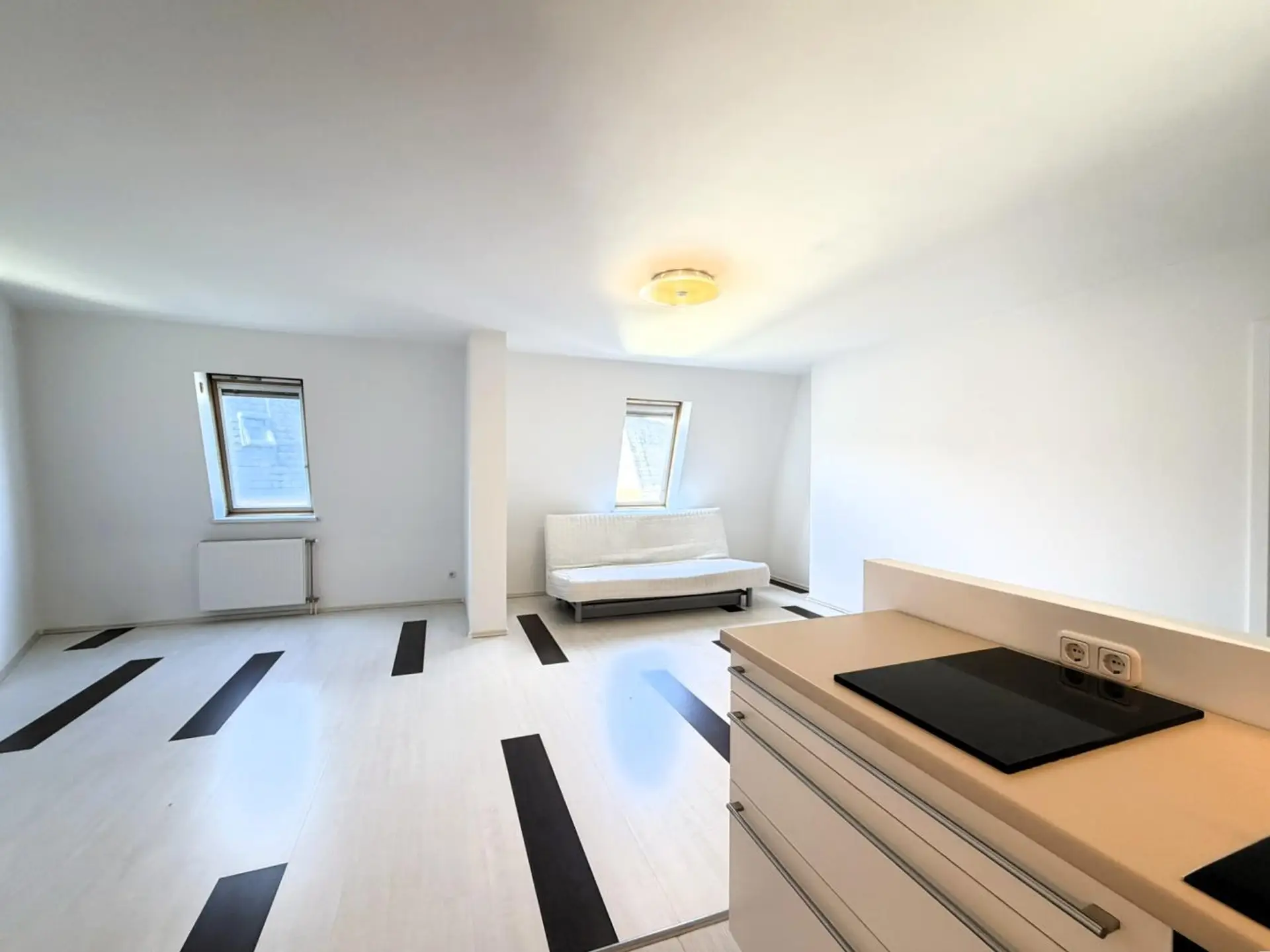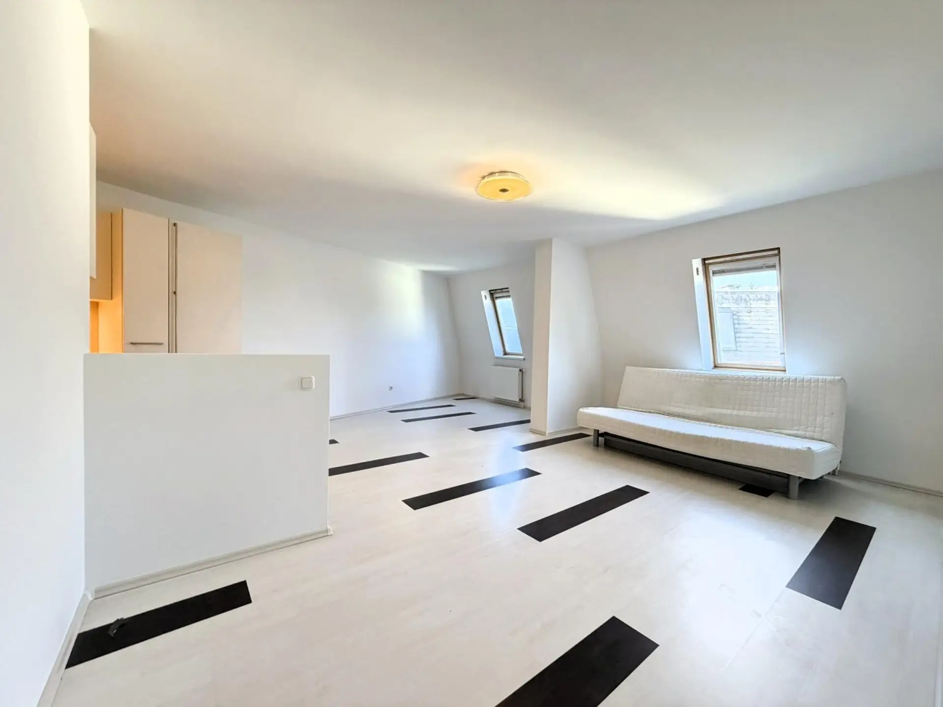 Die Wohnung bietet rund 54 m² Wohnfläche und befindet sich im Dachgeschoss ohne Lift. Der Fokus liegt klar auf dem großzügigen, etwa 35 m² großen Wohnbereich mit offener, moderner Küche inklusive Gaskochfeld. Der Raum wirkt luftig und bietet ausreichend Platz für Wohnen, Essen und Arbeiten.